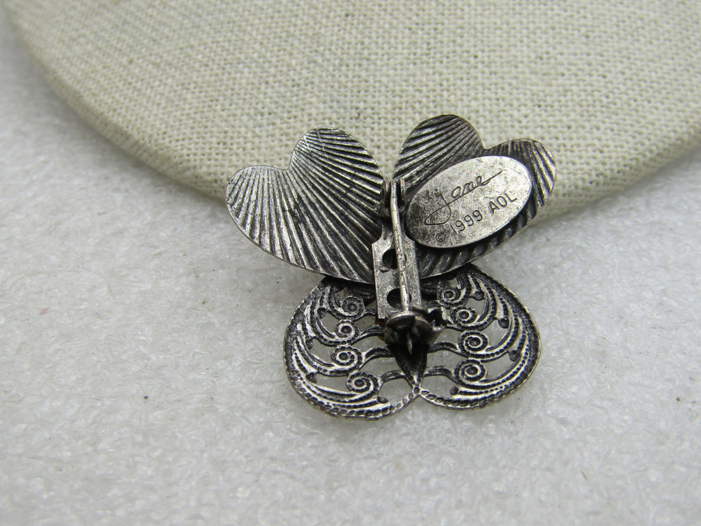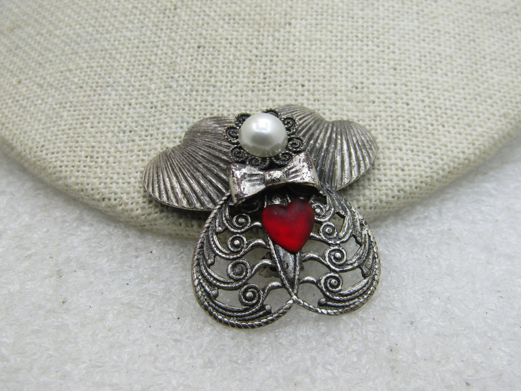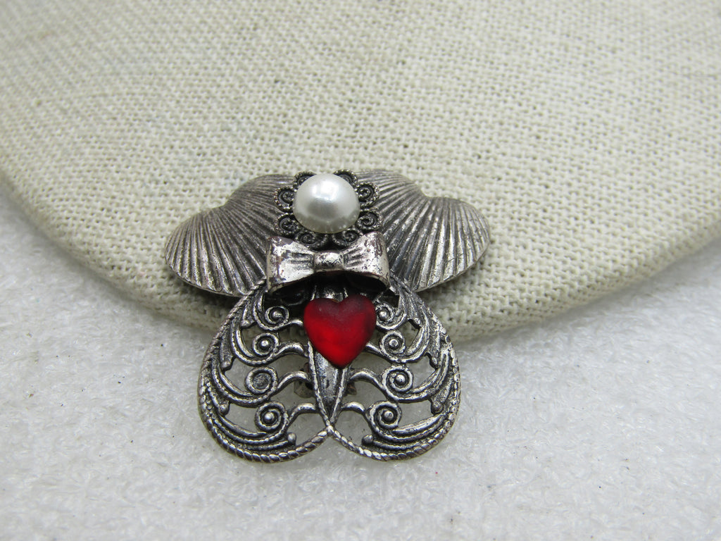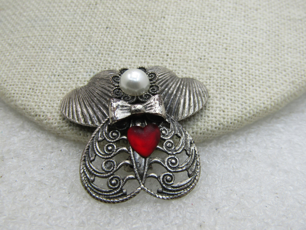 Vintage Angel Brooch Signed Jane with Faux Pearl Red Heart, 1999. silver tone. Signed Jane 1999 AOL. Filigree dress, ridged heart wings. 1-3/8" tall and wide. Good to very good condition. Jane Angel pieces do have a following. (INV. W.3720.5 SS1087 LMV 5/9/20).