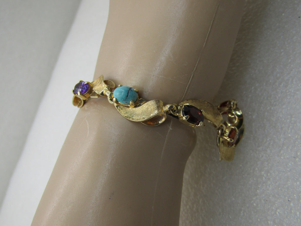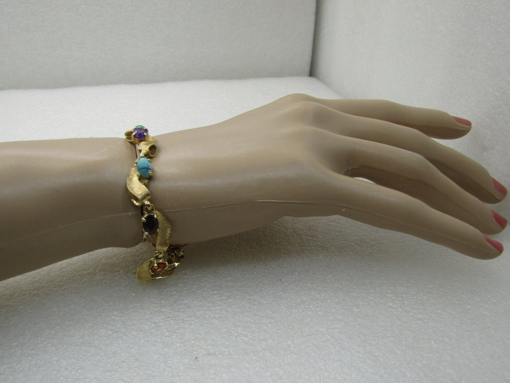 Vintage 14kt Mixed Gemstone Leaf Bracelet, appx. 13.79 gr., 7", Safety Chain. 7 oval gemstones are red tourmaline, green tourmaline, amethyst, citrine, garnet at an appx. 3.5 TCW and in addition there is an appx. 6mm turquoise and carnelian cabochon that are each apx. .50 ctw for a TCW of 4.5. Each curved leave holds a stone - the leave is a curved and brushed finish. Each link is appx. 17mm long and 9mm wide. 10 total links. Over 3" safety chain that is attached, large spring ring clasp. 1960's or earlier. Marked 14kt, tsted. Not signed by them aker. This is a special bracelet, well made. (INV. W.71820.44X. SS2139 LMV LD7/30/20)