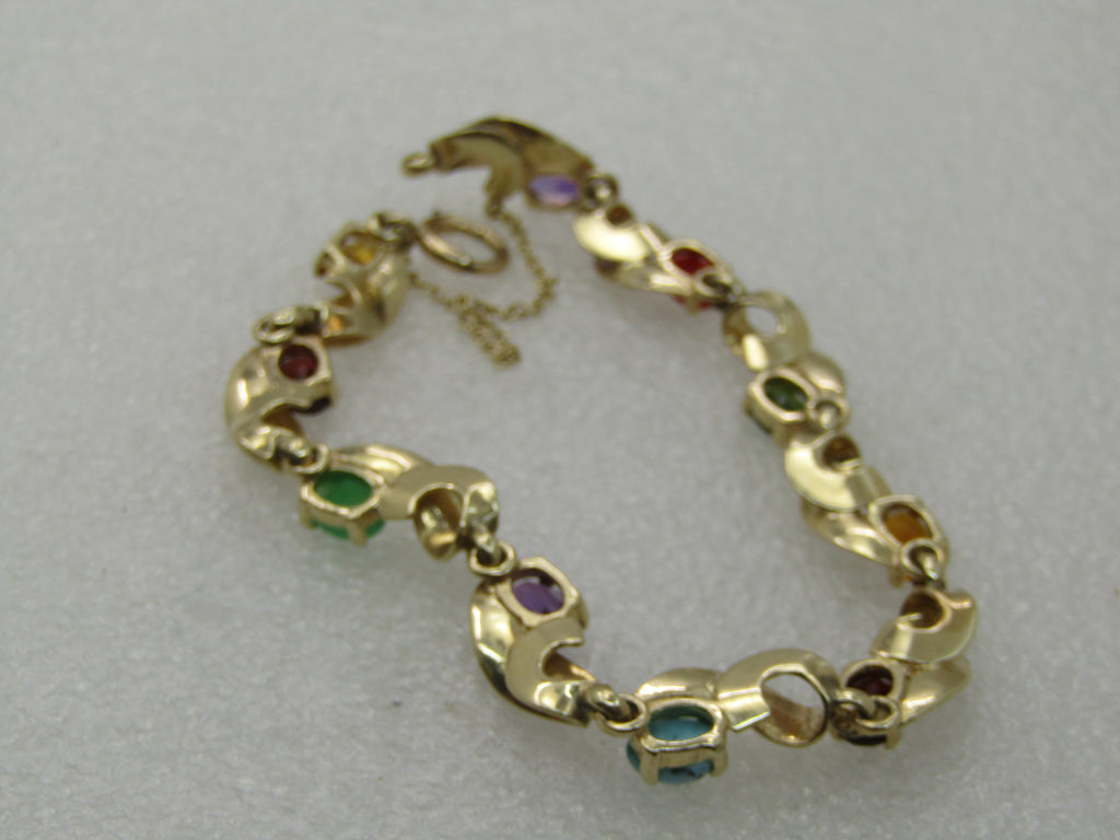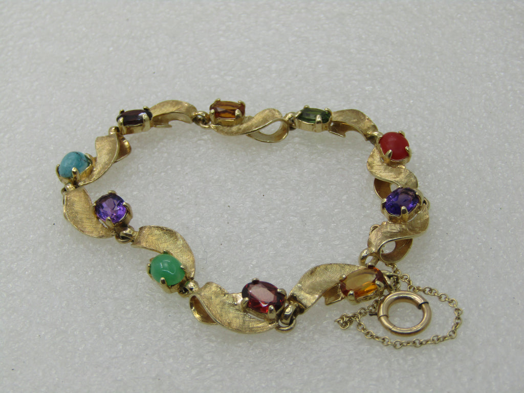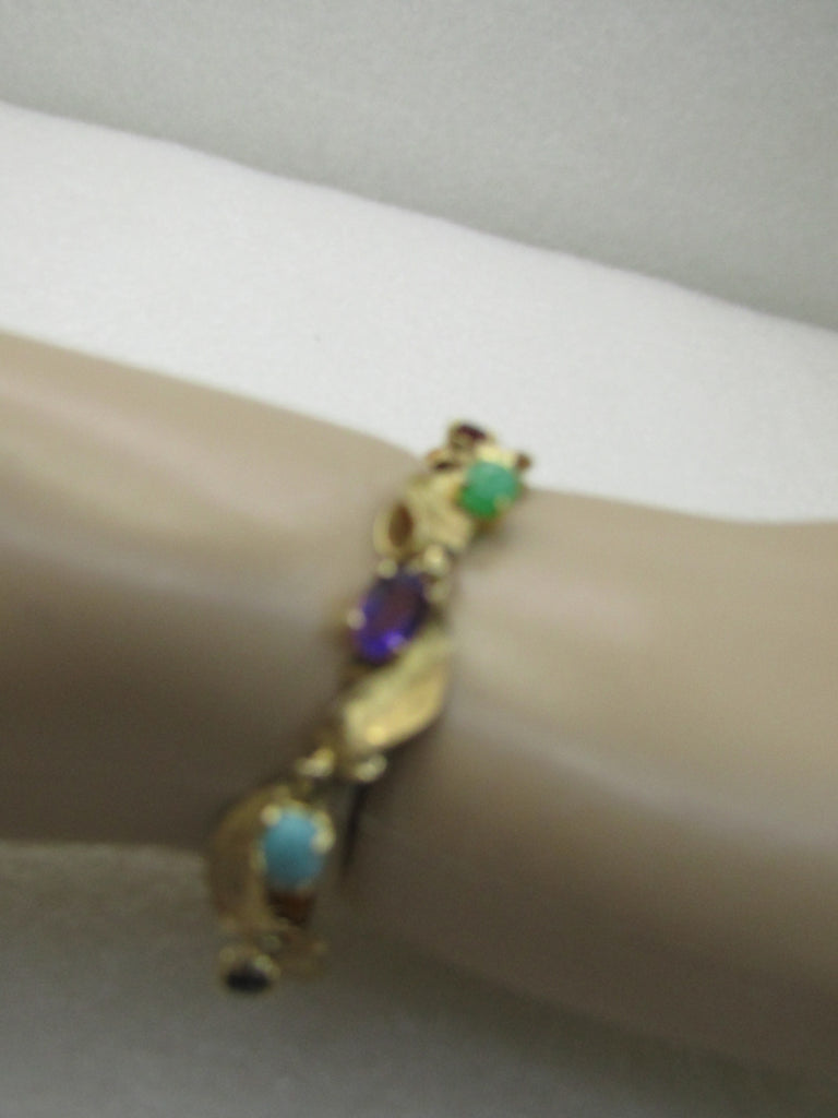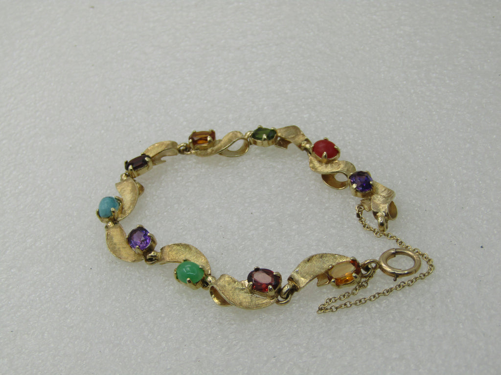 Vintage 14kt Mixed Gemstone Leaf Bracelet, 7", Safety Chain