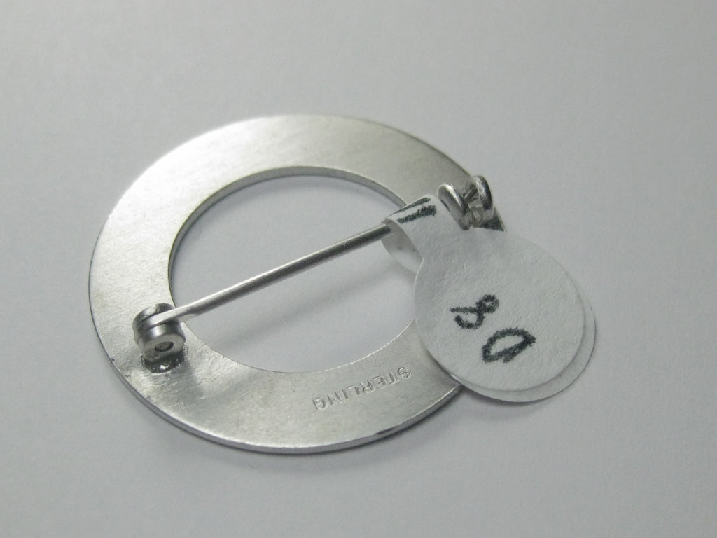 Vintage Sterling Silver Aqua Guilloche Brooch, 1-1/8" Circle. It is marked sterling and tested. Weight is appx. 4.75 gr. 1950's-1960's. Many times these are made in Norway but there is not way to know as this is not signed by the maker. It has a angled line design/grid spiraling around the brooch. Very good condition, locking clasp. (INV.D.8.A11.10 SS5337 LD 7/26/21) PA M22220