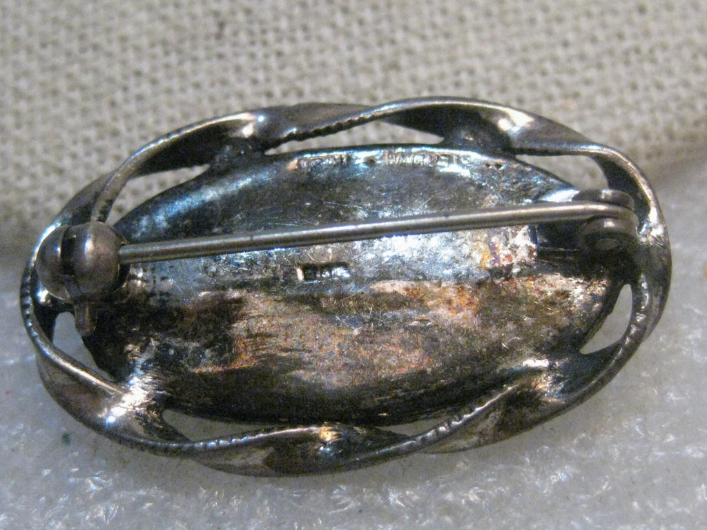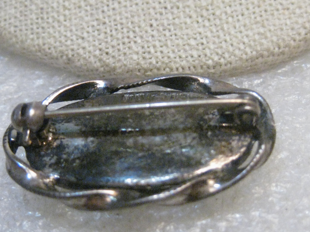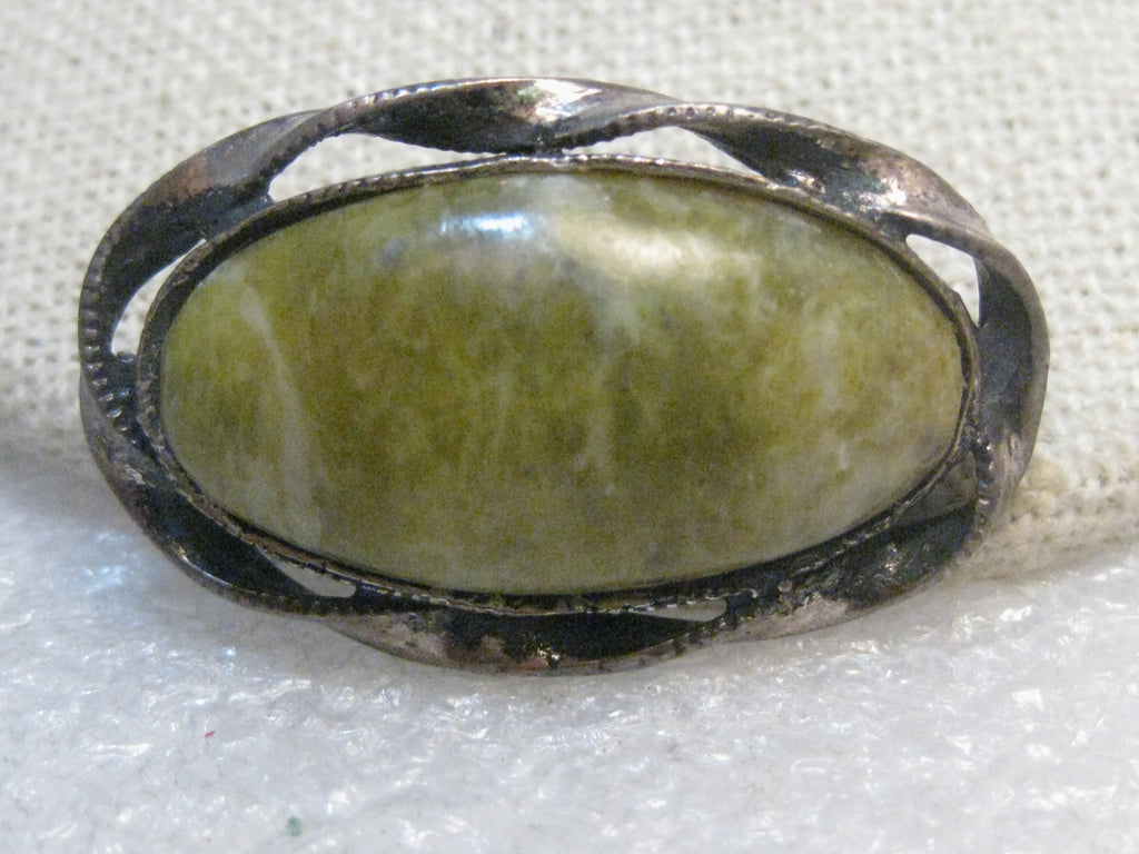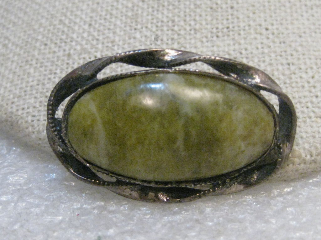 Vintage Sterling Silver Serpentine Brooch, Southwestern and crossover traditional brooch. It has an oval stone that is appx 28mm by 14mm with a twisted silver frame and open areas between the bezel-set stone and frame. It is 1.25" long and 7/8" wide. Age is appx. 1960's. The stone is a pale avocado green with some lighter colors throughout in white and shades of green. It is signed what appears to be JJO. Tested as sterling. This came from a PA estate. Weight is 8.15 grams. See photos. (Lot Loc. W.6.1017G2.1X1 - LD 8/16/17)