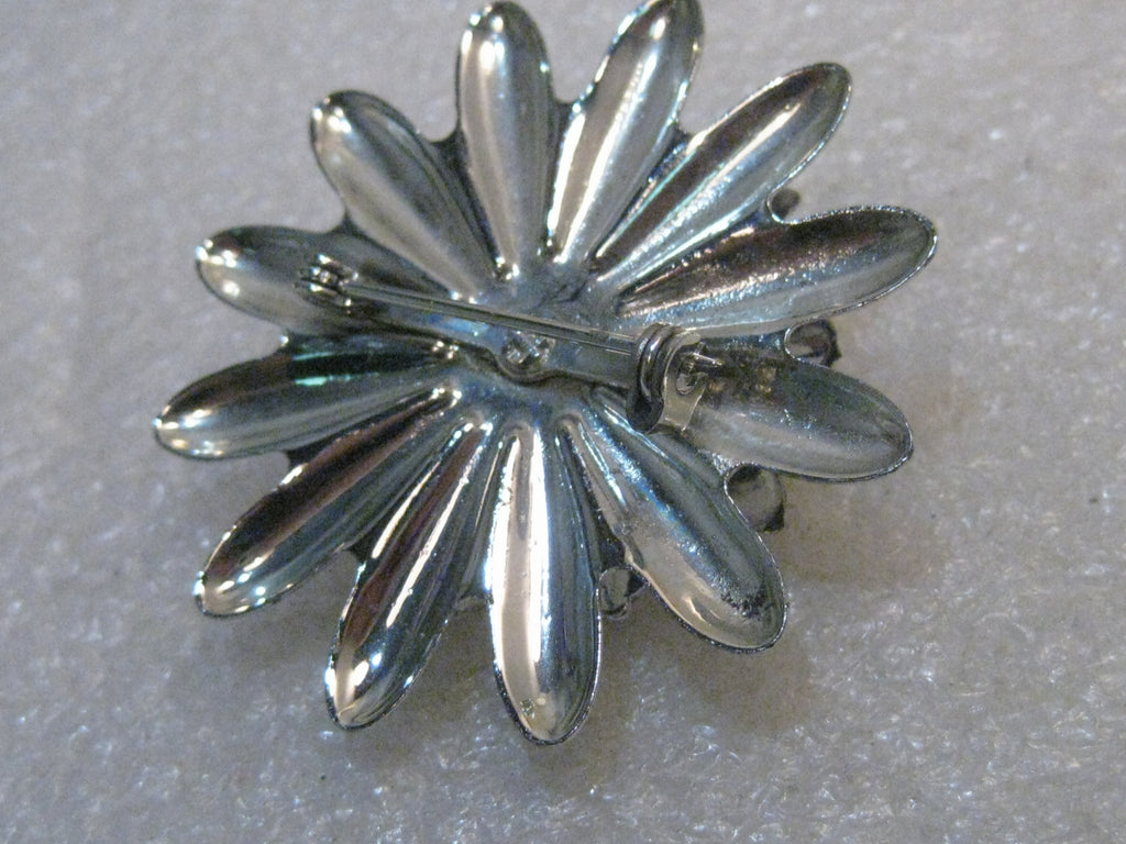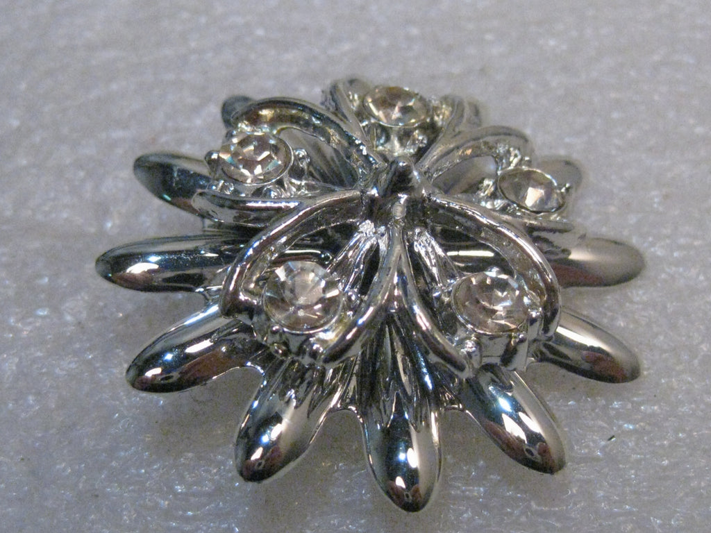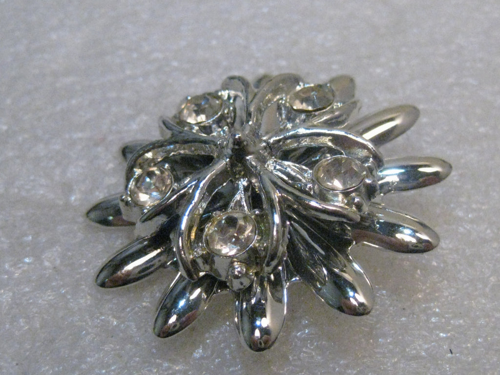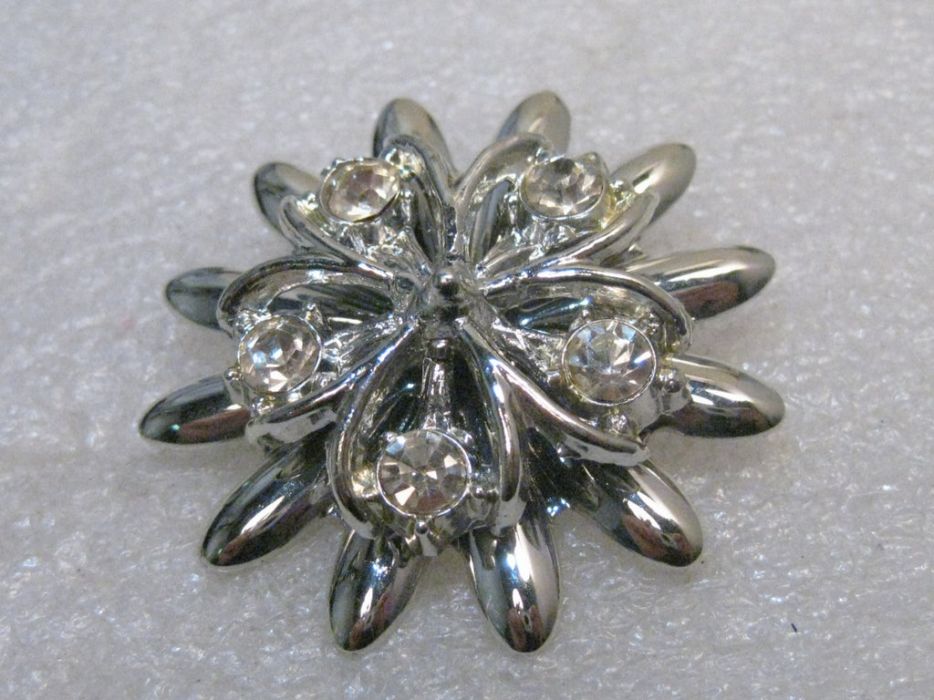 Vintage Tiered Blossom Brooch, w/ Rhinestones, 1960's, dogwood look, It has daisy-like petals on the bottom tier with shorter blossom on top that has the look of a dogwood blossom with a 5mm rhinestone at the tip of each petal. It is 1.75" across. It is not signed. Very good condition. This came from an Estate sale in PA. See photos. W.4.8-5.1617.2- LD 11/19/17