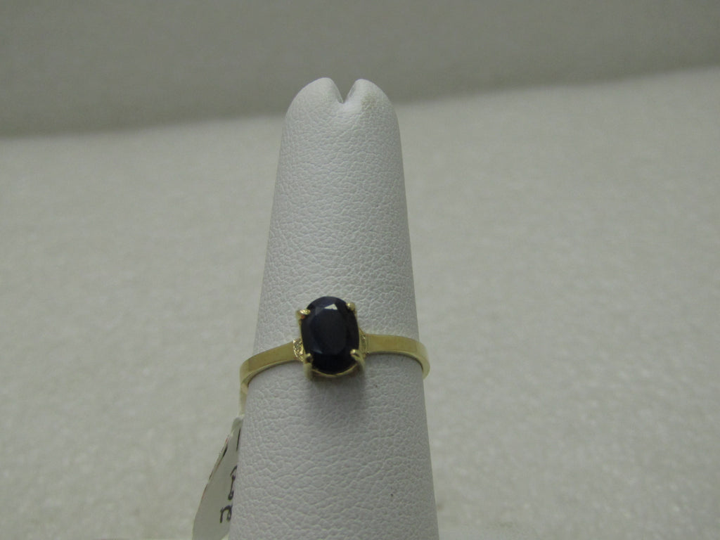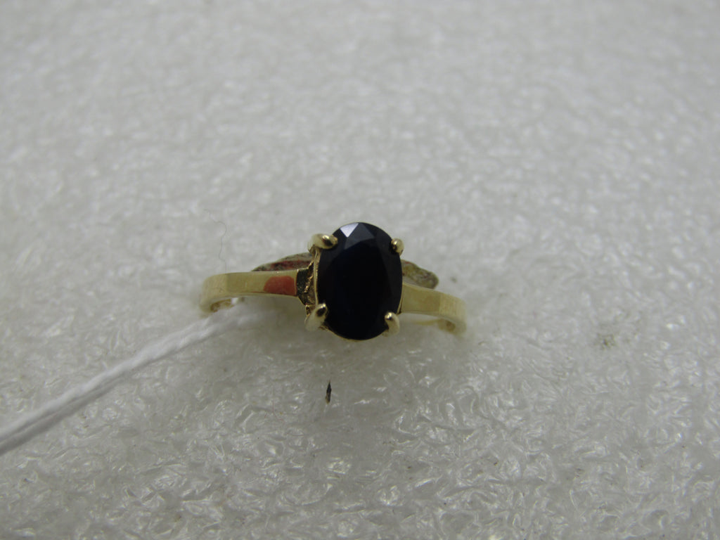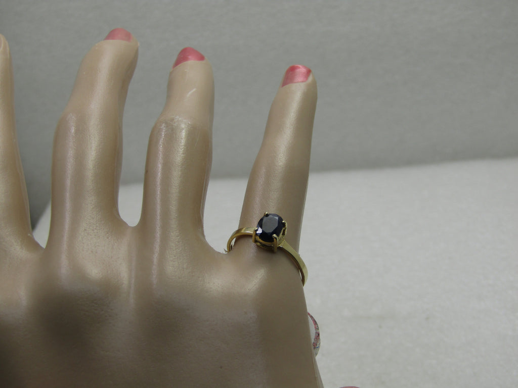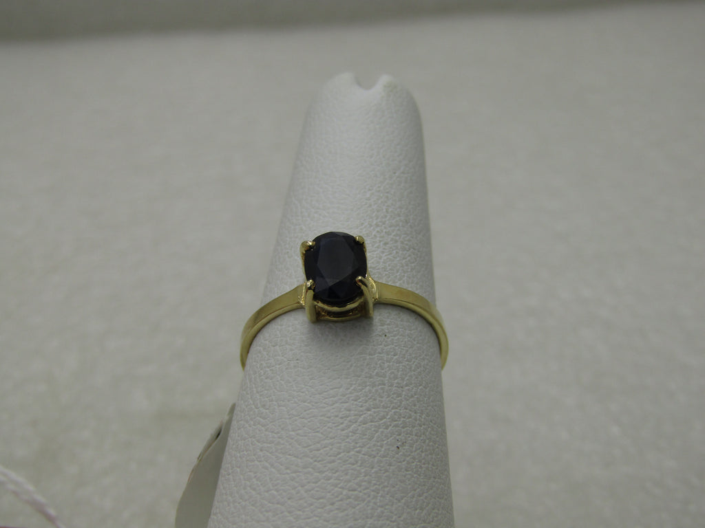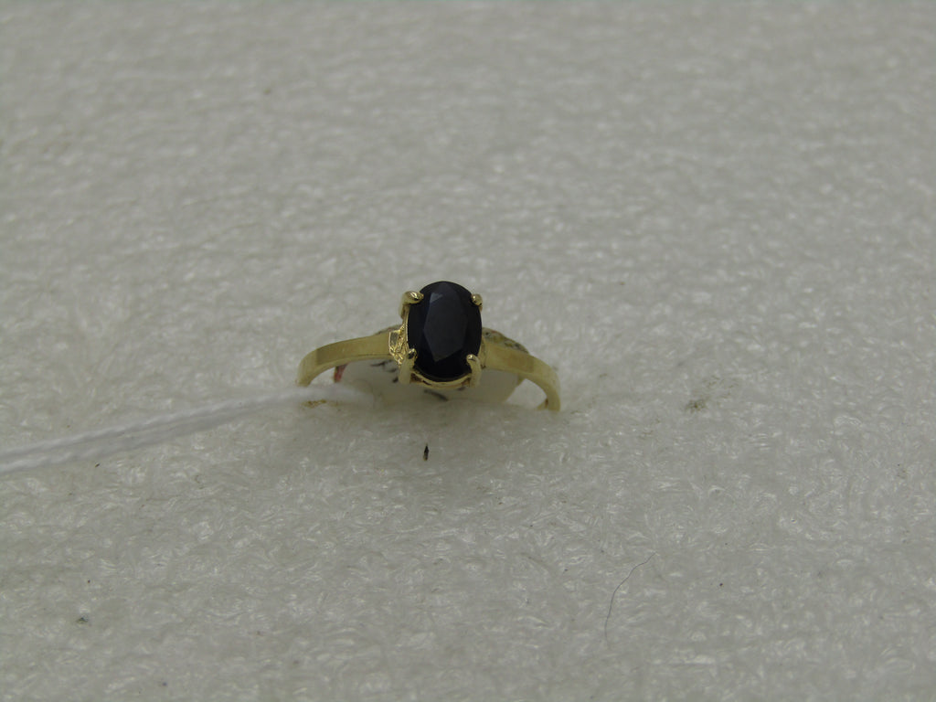 10kt Black Spinel Solitaire Ring, Sz. 6.5, appx. 1.29 gr. Yellow Gold. The stone is oval, appx. 6.5mm by 5mm .75 TCW. The Ring is 6.5mm on top and going down the finger. The stone sits on a bridged undercarriage and sits up slightly on the finger. The band is appx. 1.5mm to 1.6mm - is slightly thinner at the base of the setting and widens slightly as the band goes around the finger. It is marked 10kt and tested It is signed with a D inside a diamond outlined shape. Very good,l ilke new condition. LOT.W.1.420.10X4. SS161 LMV LD 1/3/21)