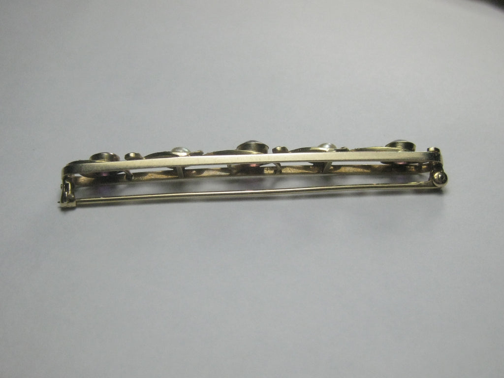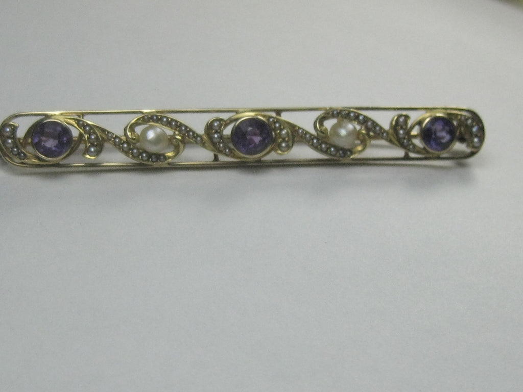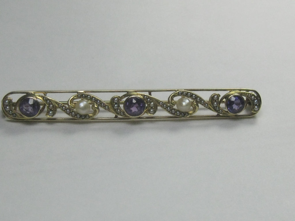 Edwardian 14kt Amethyst & Seed Pearl Brooch - Estate Find. 2.5" long bar brooch, marked 14kt, tested and also signed with what looks like a forward and backward J type mark on the clasp. It has curved scrolls between and around the stones with pave set small seed pearls throughout the brooch. Weight is appx. 6.05 gr. The bar brooch is appx. 3/8" wide. The brooch has 3.1mm-3.2mm pearls and three Old Mine cut amethysts that are appx. 3.5mm across for an appx .45 TCW in amethysts. Locking clasp. Very good condition and quality piece. (INV.W.10.519.11X).