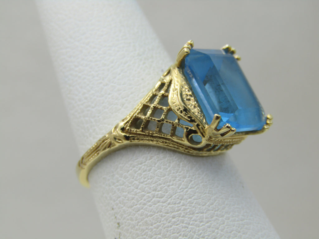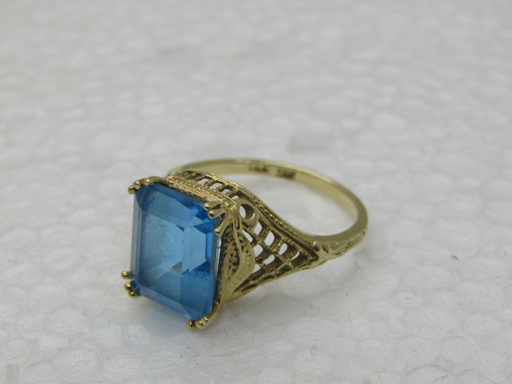 14kt Swiss Blue Topaz Ring, 5.25 TCW, Sz. 7.5, 4.22.gr. Vintage Themed Design. Signed ZRW (trademark of Jewel America). The stones is a vibrant blue, rectangular stone that is appx. 11mm X 8.5mm. Step cut. Clean stone. Filigree setting up the shoulders of the ring. It is 10mm wide at the base of the stone and tapers to 1.5mm at the back of the finger. Marked 14kt, tested. December birthstone. Great Gift. Very good condition. (INV. W.22020.15X SS1418 LMV D 5/24/20)