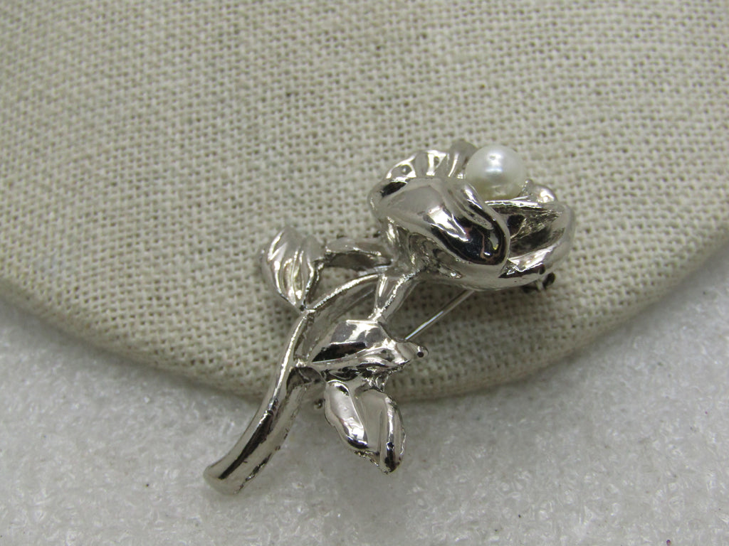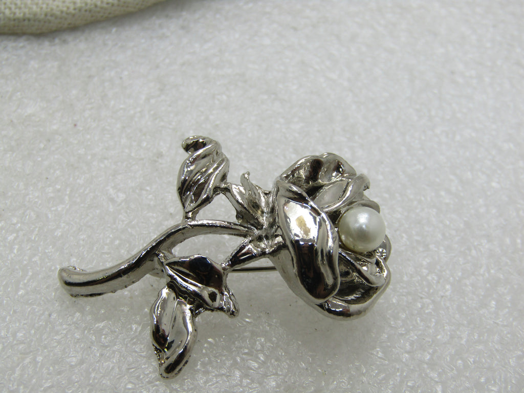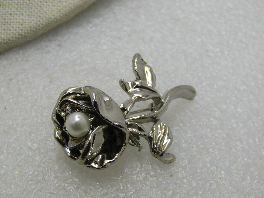 Vintage Rose Brooch with Faux Pearl, 1.75"