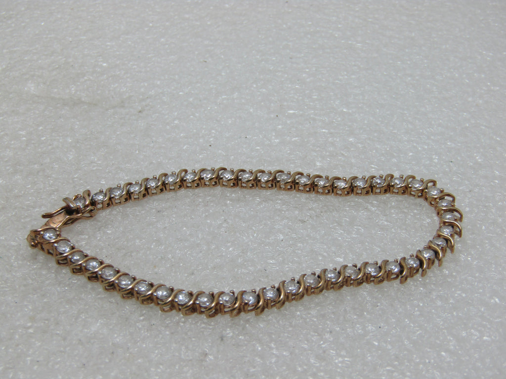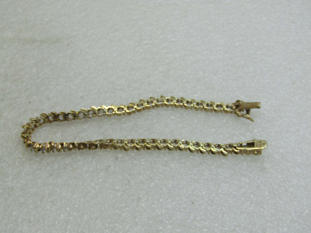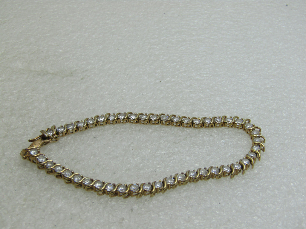 Sterling Gold Vermeil CZ Tennis Bracelet, 7.5", 8+ TCW, 11.40 grams, and appx. 4.5mm wide. This has 45 clear CZs that are each appx. 3mm to 3.3mm. There s a curved subtle X shape dividing each stone that is slightly longer than each CZ. Box clasp with safety locks on each side. Marked .925 and tested with gold vermeil. Signed with a mark and marked .925 and CZ. Very good condition. (INV. W.22020.2X2 SS 1330 LMV LD 5/20/20).