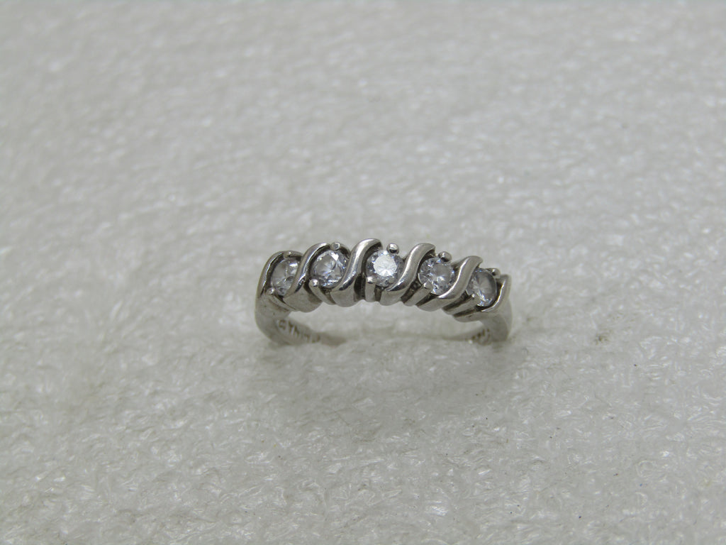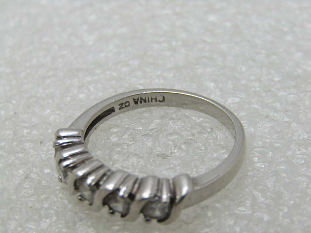 Vintage Sterling Silver CZ Band Ring, Sz. 7, 3.12 gr. Marked sterling and tested. It has five 3mm round st ones set on top with an subtle S divider between each stone. The ring is appx. 4.5mm on top and tapers down to 2mm at the back of the finger. Signed with an R, China. Great too as an anniversary or wedding band. (INV. W.22020.1X1 SS 1342 LMV LD 5/20/20).