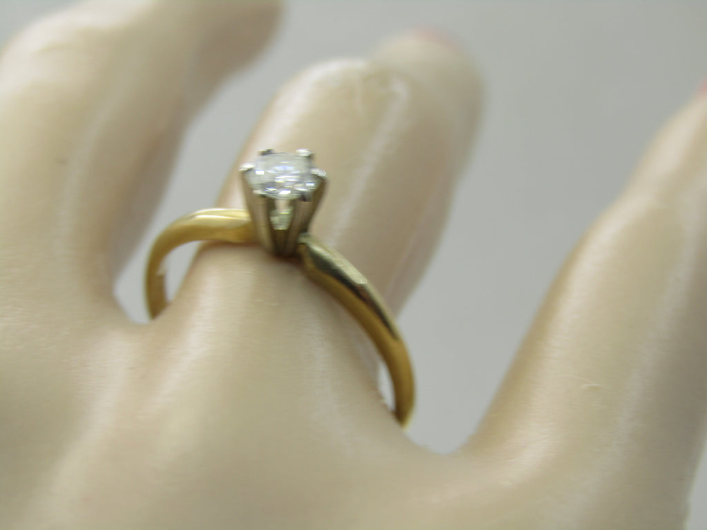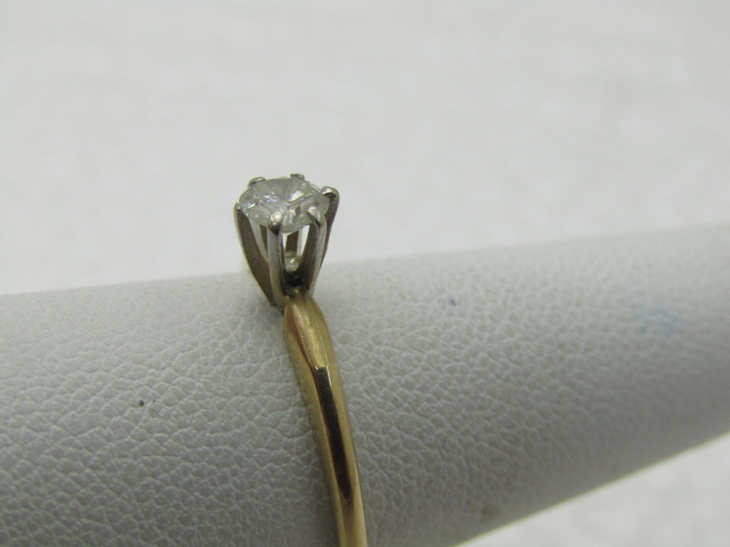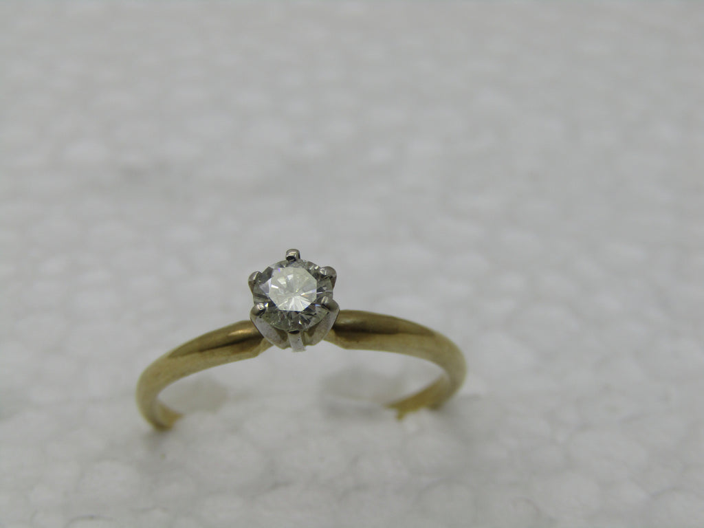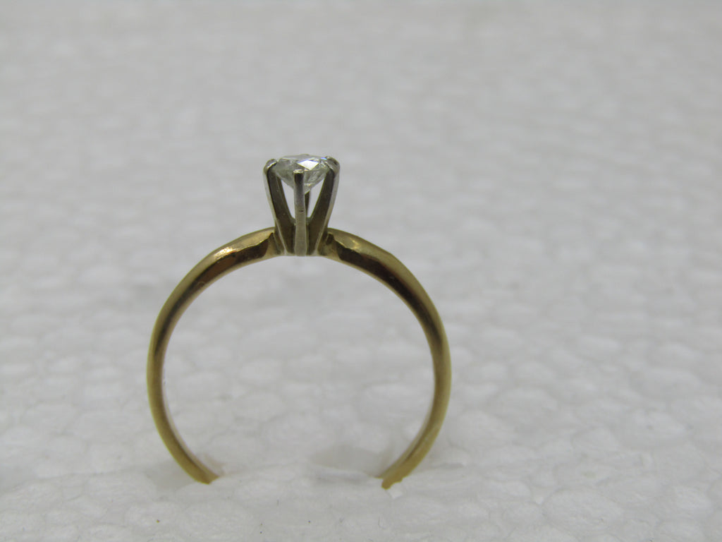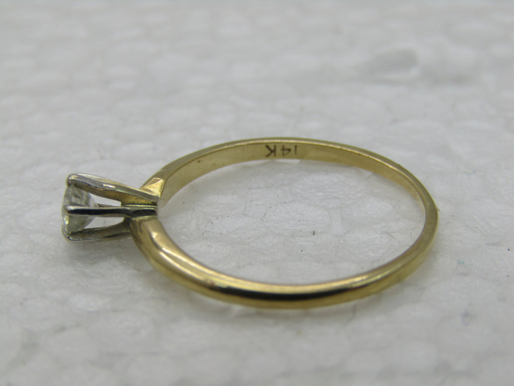 Vintage 14kt Diamond Engagement ring, 1/4 CT, Sz. 7, 1.56 Grams, The diamond is appx. 4mm across, color H/I, SI2 (some inclusions inside the stone). The band is appx. 1.8mm at top shoulders and 1.7 at the back of the finger. Six prongs hold the diamonds and are white gold prongs. Marked 14kt and also marked 1/4. Good condition. INV. W.1/1/19.NO38, 11X SS1419 LET LD 5/12/20).