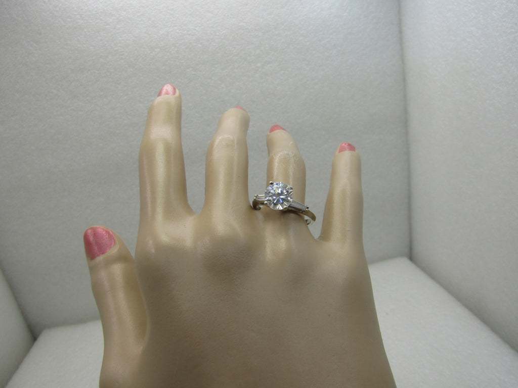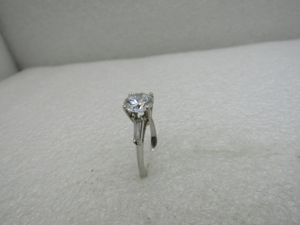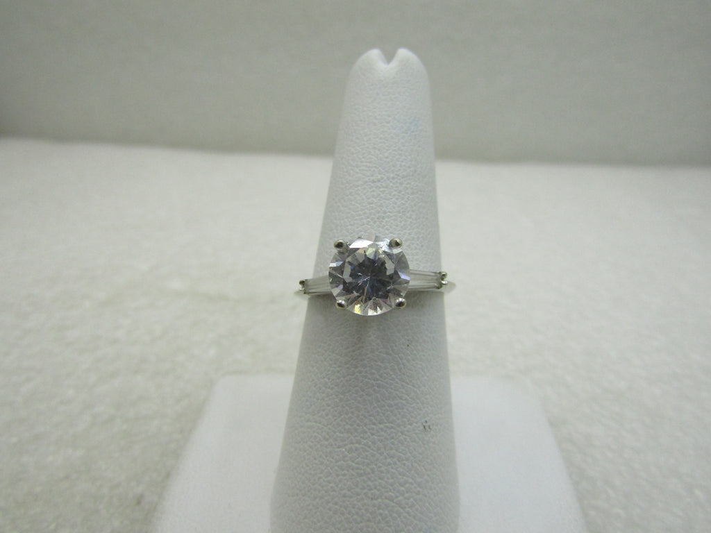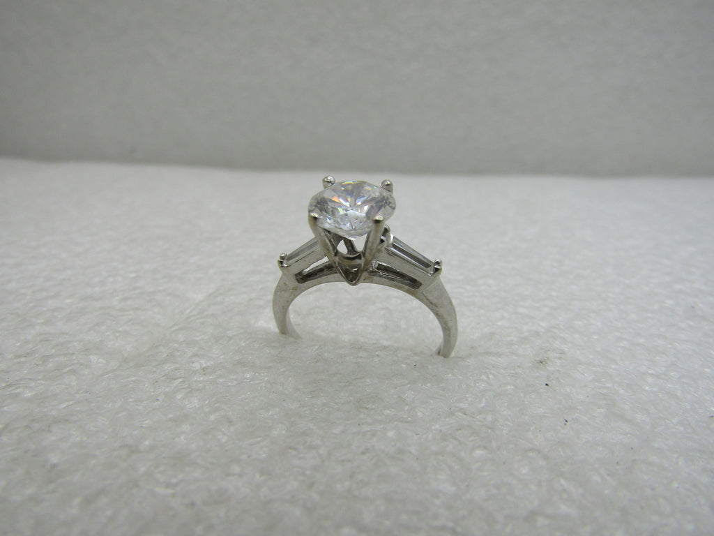 14kt CZ Engagement Ring, with Baguettes, 2.5+ TCW, Sz. 8, 3.42 Gr. Diamonique 14kt White gold marked and tested. It has an 8mm brilliant round CZ stone with a tapered appx. 6.5mm baguette on each side set lower at band lever. The main stone sits high on the finger. The band is slightly thinner on top at appx. 2.2mm and widens at the back of the finger to appx. 2.4mm. This is signed with DQ, sold on QVC. Very good condition. Lots of bling. INV. W.3720.5X5. SS1134 LMV LD 5/9/20