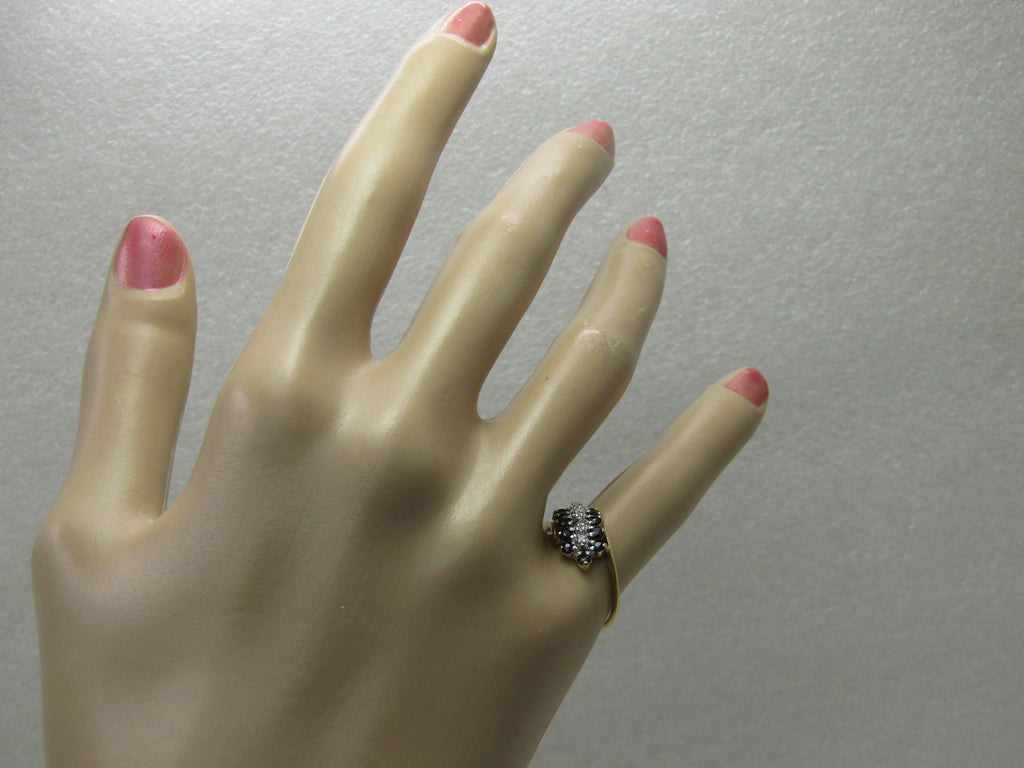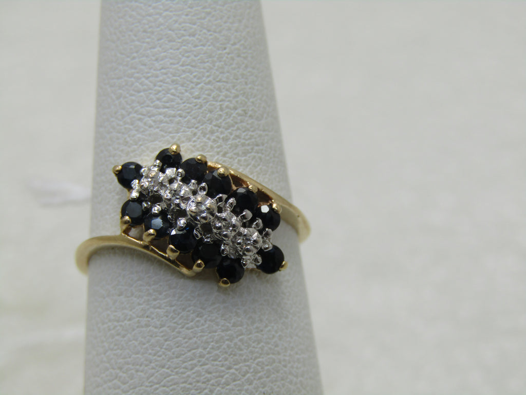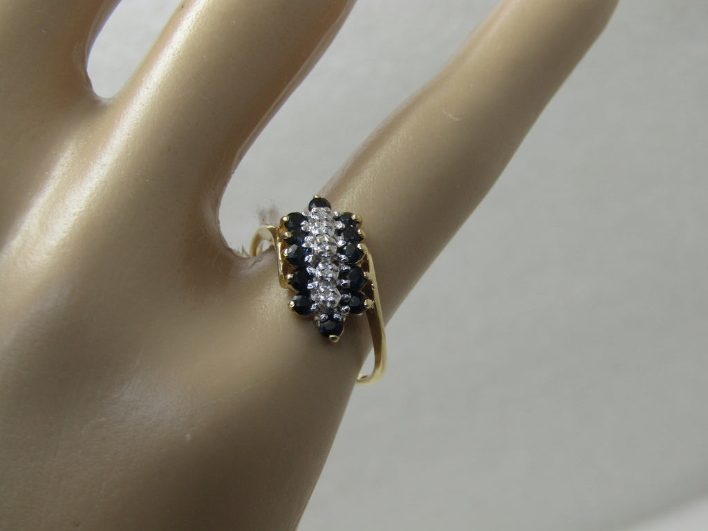Vintage 10kt Blue Spinel Diamond Art Deco Theme, Ring, Sz. 6.5, Appx, 1,72 grams Diagonal setting yellow gold and white gold. 12 dark blue stones that test as spinel, round cut at appx. at 1.5mm to 1.8mm. There are five diamond chips down the center in a waterfall design. The diamonds are set in whit gold and the rest of the ring is 10kt gold. Tested and signed PDN. Age is appx. 1980's-1990's. Very good condition. (INV. W.1.420.10X52. WB197. LMV1/14/20).