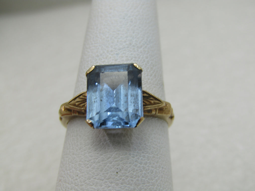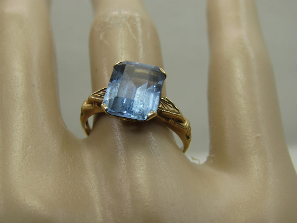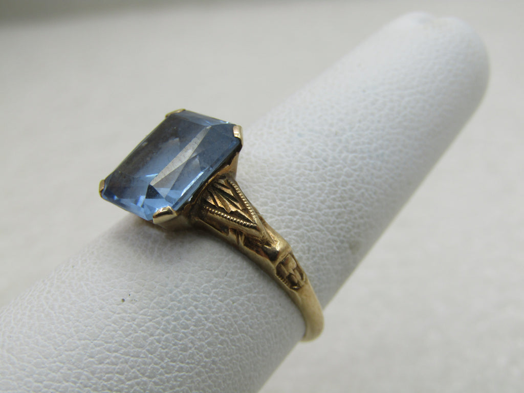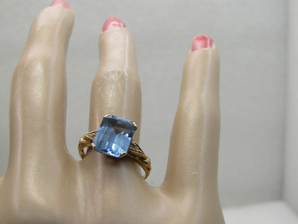Vintage 10kt Blue Topaz Princess Cut Ring, Art Deco, Sz. 7, 3CTW