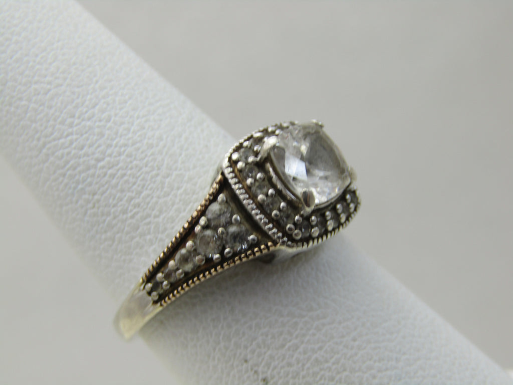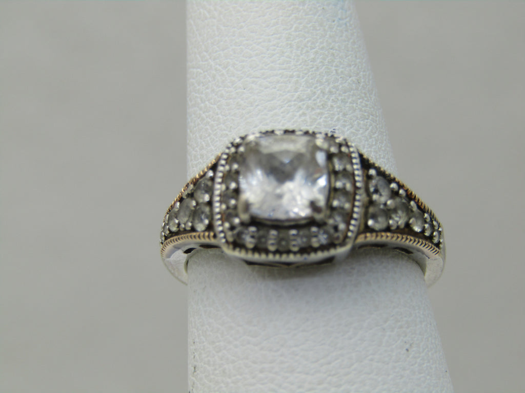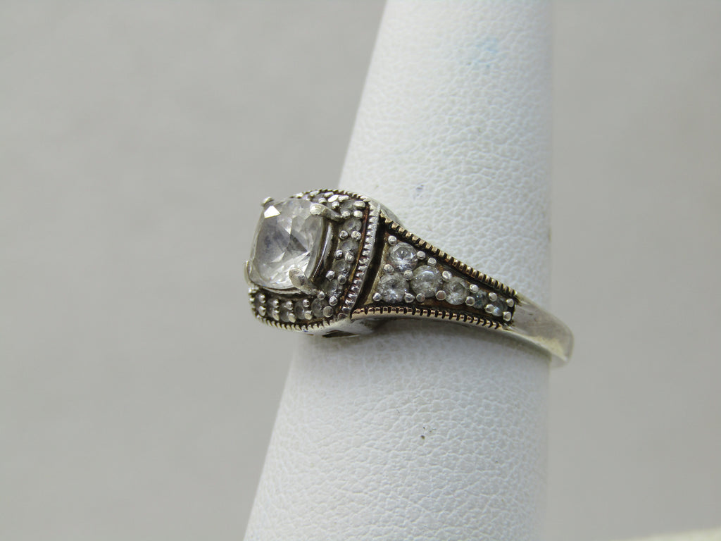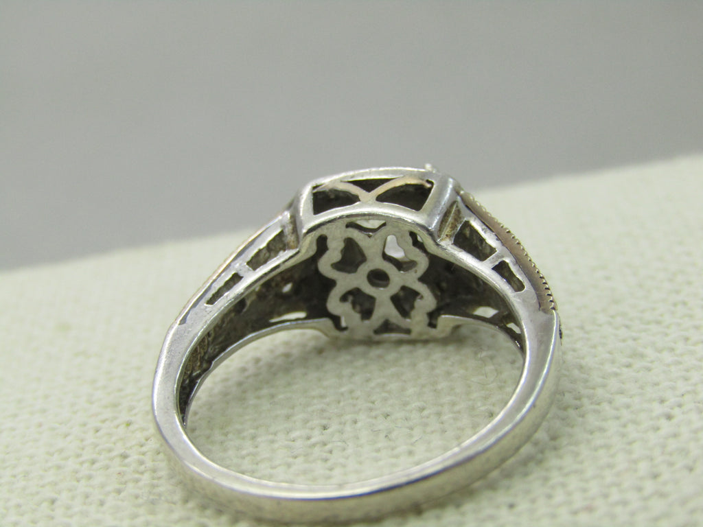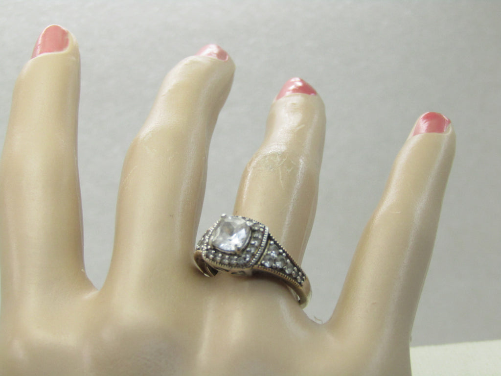| Vintage 10kt Moissanite/White Sapphire Halo Ring, Sz. 7, Signed JWBR, White Gold, Appx. 1 CT main stone with 28 small moissonaite or white sapphires in the halo and down the shoulders of the ring. The stone has double refraction on the facets of the underneath the stone which is a property of both moissanite and white sapphire. I believe this is moissante but not 100%. It is marked 10kt and tested. Weight is appx. 3.88 grams. Square cushion cut stone that is appx. 5.9mm by 5.7mm. Exact measurement difficult due to setting. It has a bridged front and back and the stone sits up higher on the finger than the rest of the setting. Good to very good condition - some typical light wear on the main stone. Undercarriage of the ring has nice detail. The ring setting on top is appx. 10.5mm by 9.5mm over the finger. (INV. W.22020.11X S1417 LMV LD 5/25/27) |