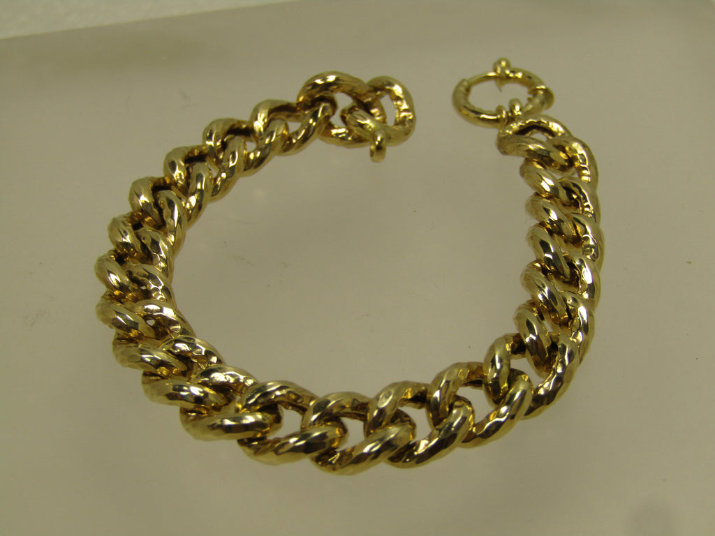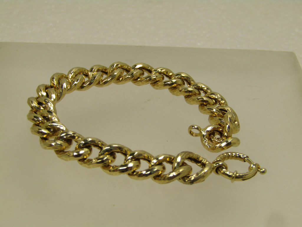 Vintage 14kt Curb Link Bracelet, 7", 8mm, Signed AK Turkey, 1980's-1990's. This has a textured finish to the links - it is appx. 7.73 grams. This is a 8mm wide hollow link with a wide 11.5 spring ring clasp that clicks into a ring on the end link. It is signed AK 14kt Turkey on the last ring near the spring it. It has been tested and tests as 14kt. Chunky link that is appx. 2.5mm thick on the outer frame of the links. It is a bracelet that is great for anyone that has the wrist for a 7" bracelet. Very good condition. (W2726.88X SS17369 J MV LD 2/11/26).