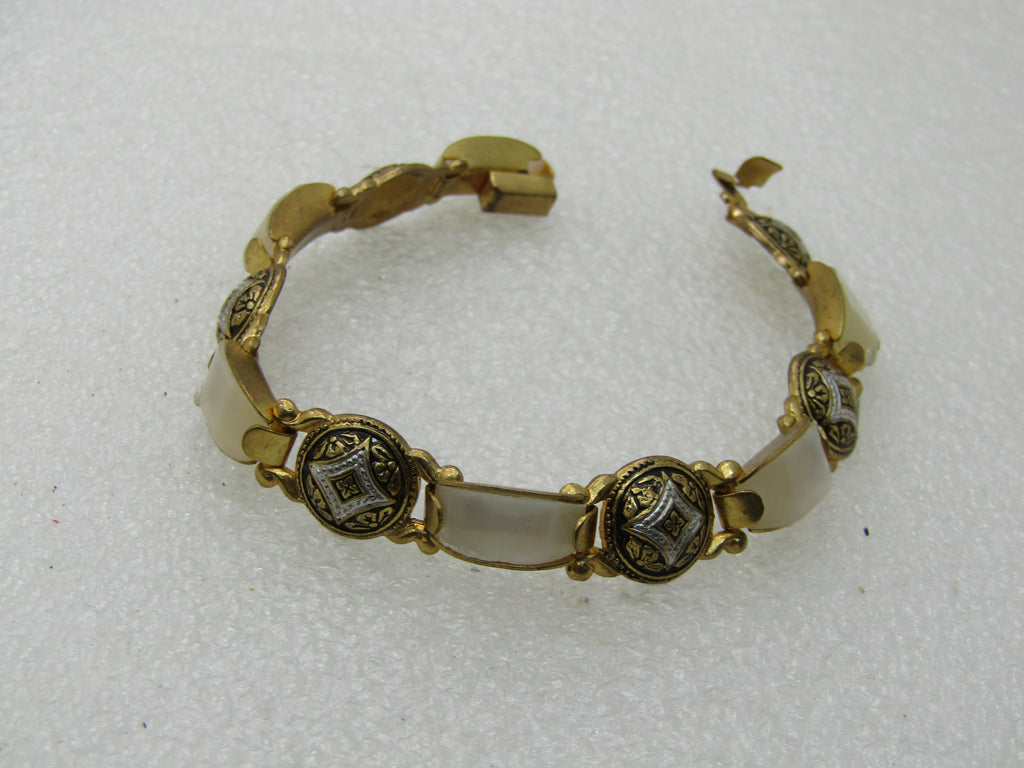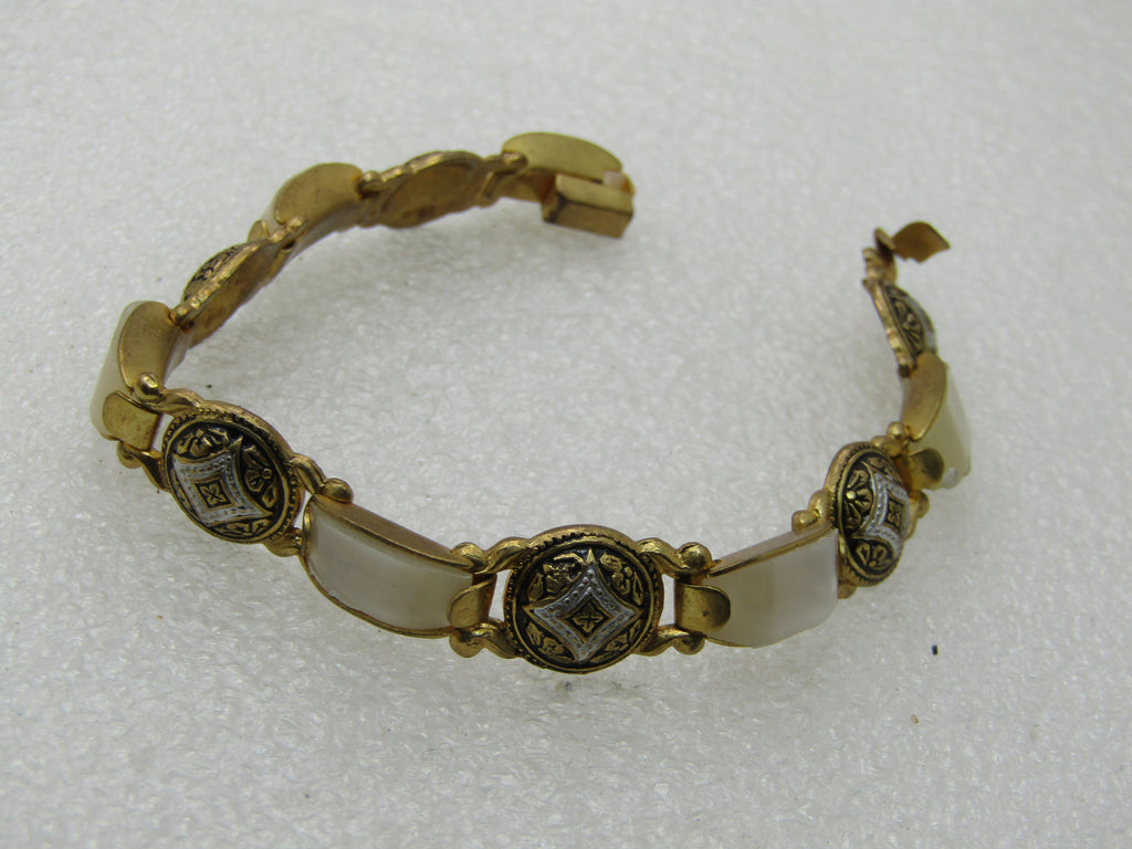 Vintage Damascene Mother-of-Pearl Bracelet, 7", 6.5-11mm wide, 1960's-1970's, gold tone, round damascene black, gold and silver links with arched mother-of-pearl links between.  Box clasp.  Not signed by the maker.  Very good condition, very light wear.  (INV. W.2-72015.8 SS2608 LMV Ld 10/3/20)