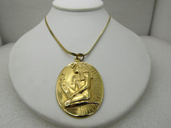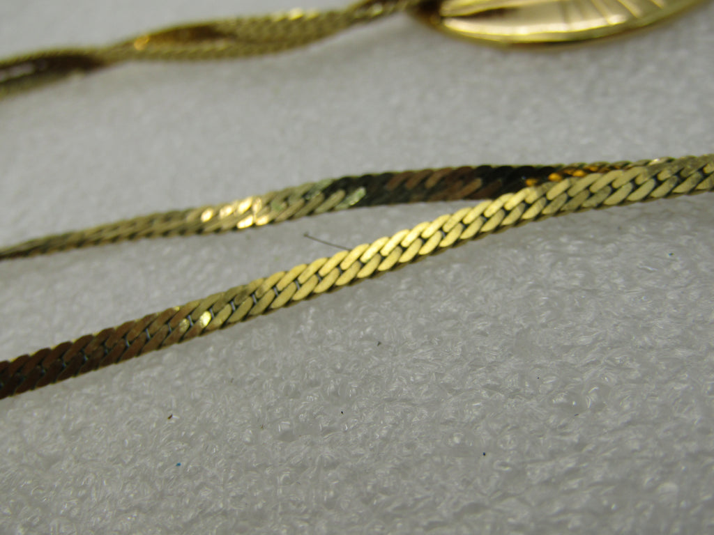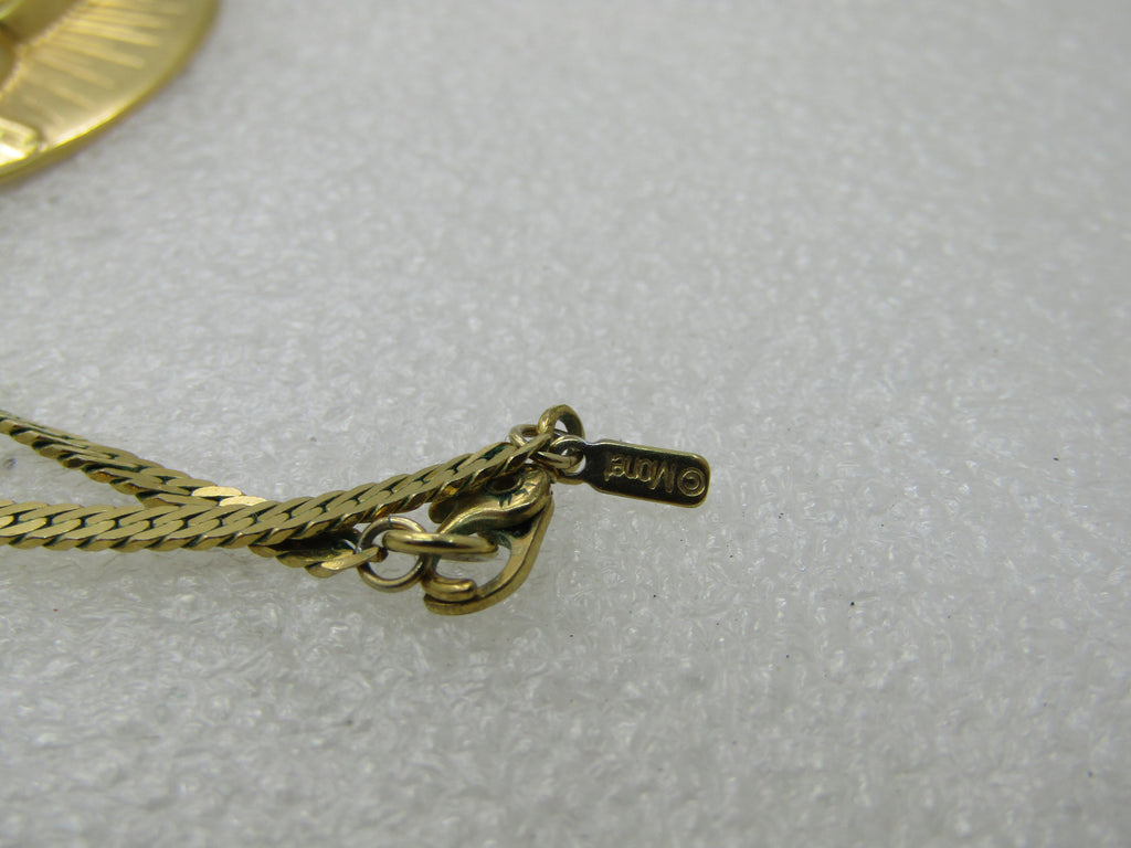 Vintage Egyptian With Ankh Pendant on Monet, 24" Herringbone Chain. Gold Tone. The pedant is a pressed Egyptian scene, kneeling figure with asp holding ankh. It is 2.25" long and 1.25 wide. The chain is a Monet herringbone necklace that is 2.5mm wide and 25" wide with the Monet hang tag. The pedant may not be Monet. Very good condition. (INV.W72020.8 SS2079 LMV LD8/15/20).