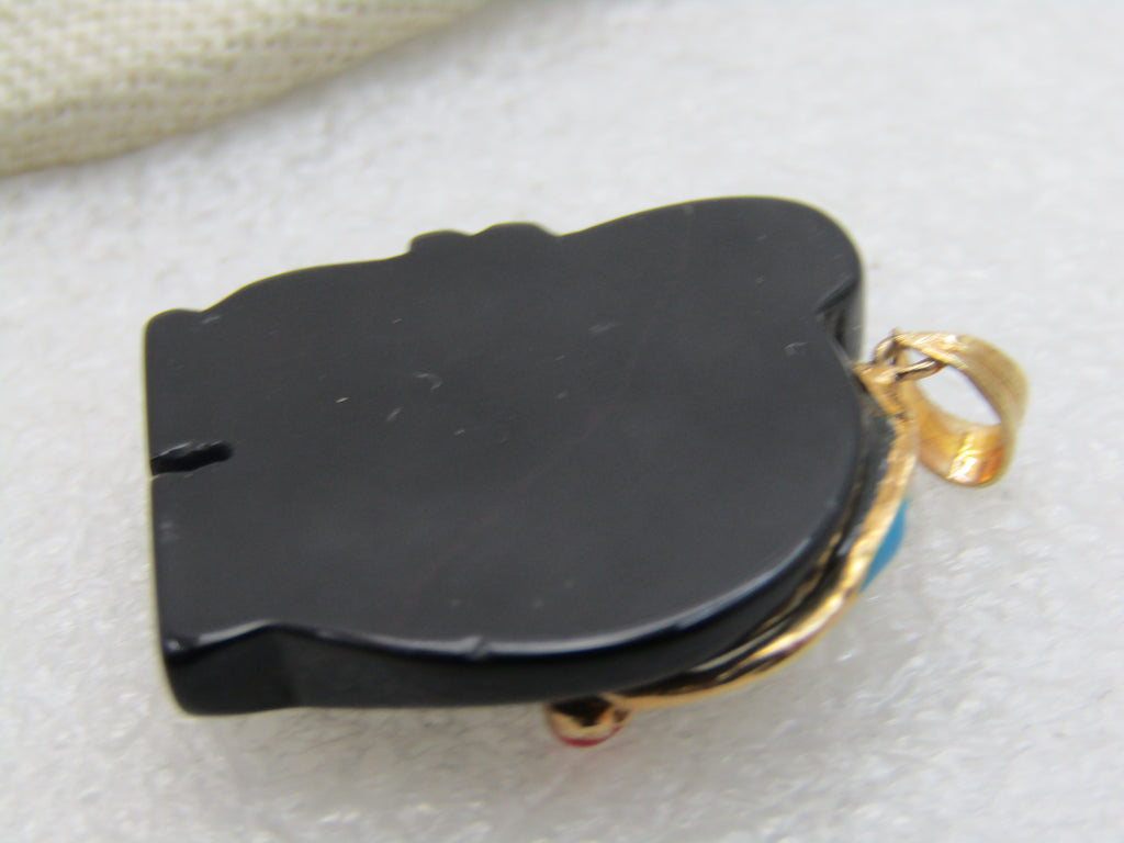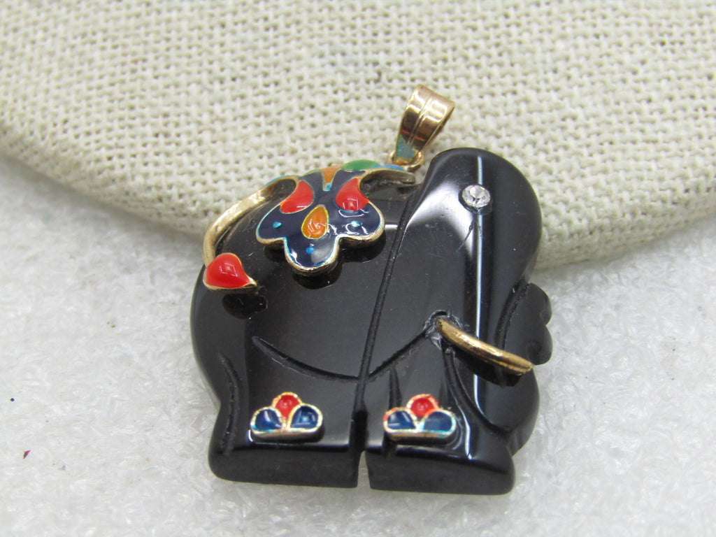 Vintage Onyx Carved Elephant Cloisonne Pendant, CZ Eye, 10kt GF