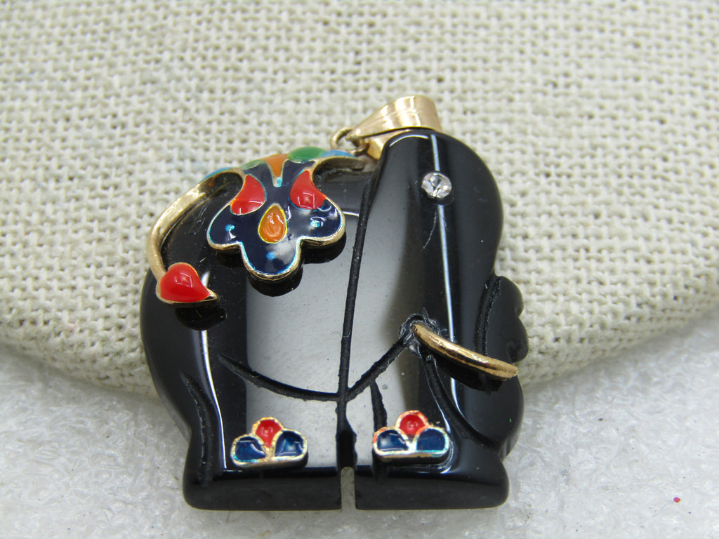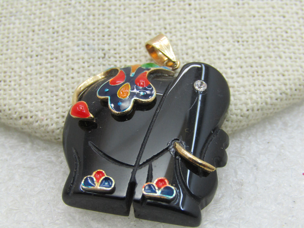 Vintage Black Onyx Elephant Enameled Pendant, CZ Eye, 10kt GF, Carved elephant with raised cloisonone floral blanket and accents and a raised bead on the tail. It is appx. 1/3-.8" tall and 1-1/8" wide. 10kt G.F. bail and tusk. Not signed by the maker. 1980's-1990's. Very good condition. (INV. W31420.1X1 SS1211 LMV LD5/2/20)