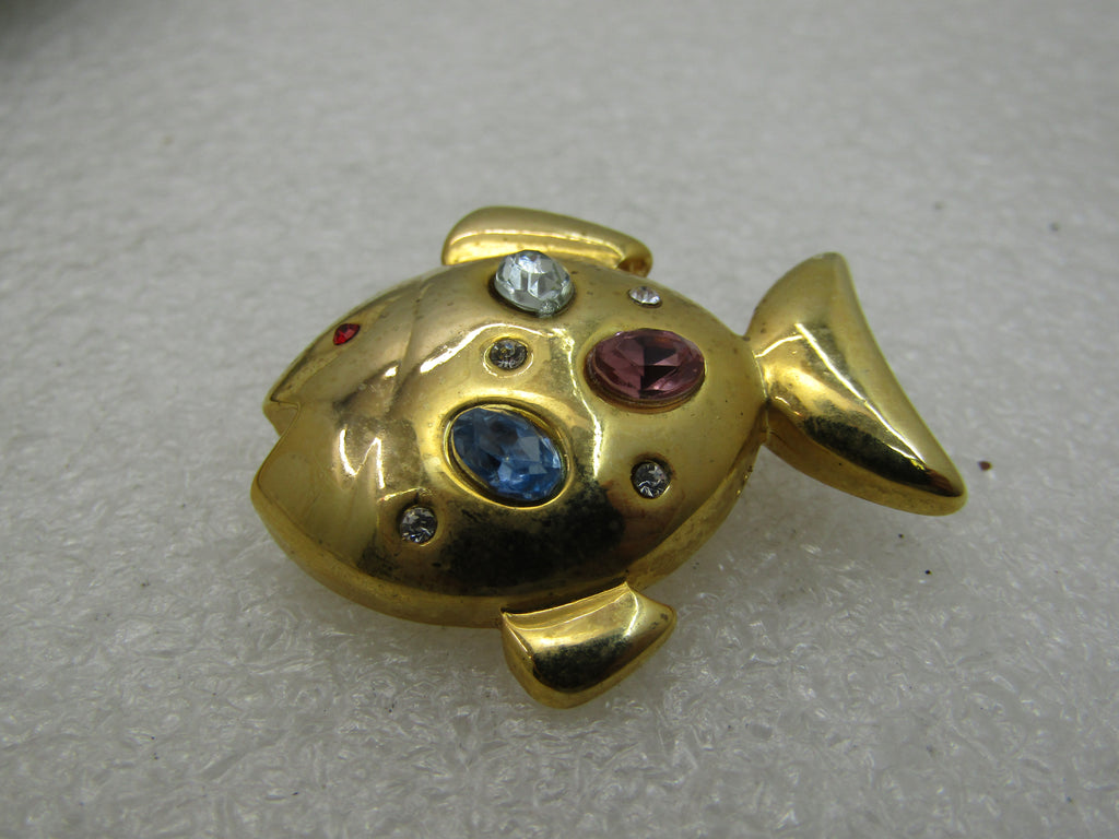 Vintage Pastel Rhinestone Fish Brooch, Gold Tone, 1-3/8" wide and 1.25" tall. Pastel pnk, blue oval rhinestones that are set in to the fish with clear rhinestone accets and red eye. Smooth and rounded finish on the fish 1970's. Not signed by the maker. Good condition with some light wear on the pin of the pinback. Othewise, very good condition (INV. W.2..3-1018.5 SS1276 LMV LD 5/3/20).