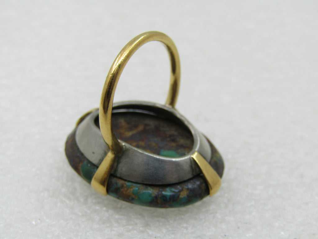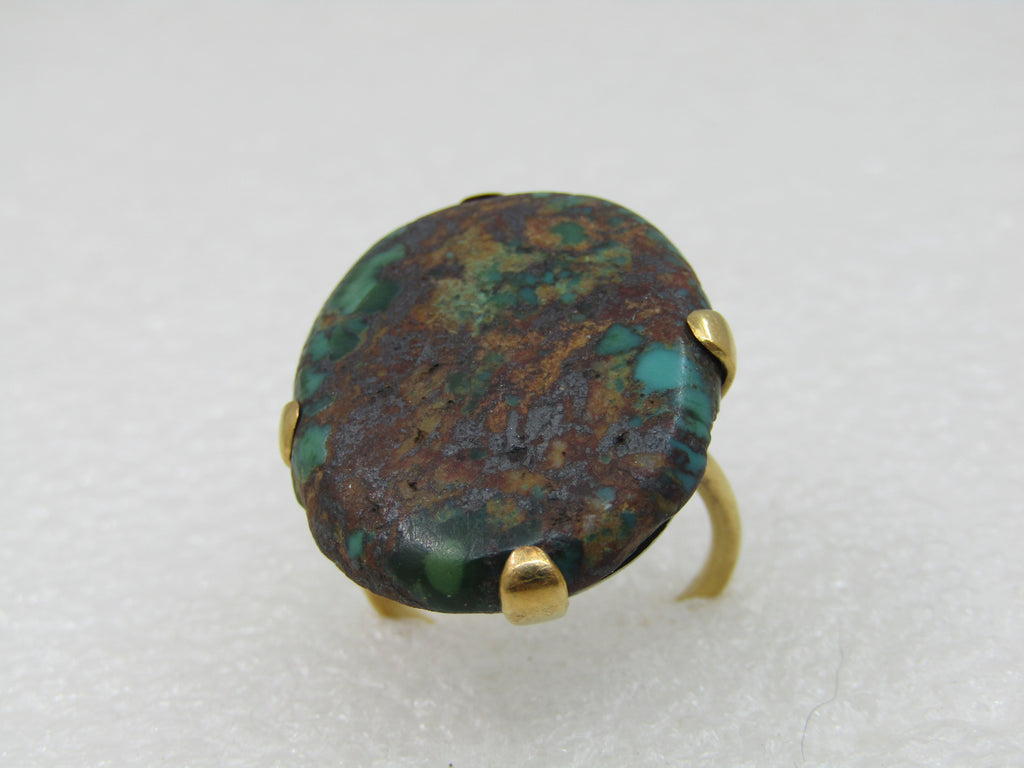 Vintage Southwestern 18kt & Sterling Gold Boulder Turquoise Ring, Sz. 5.5, 25+TCW. Likely a custom-made ring with a large turquoise with brown matrix which I believe is a Boulder Turquoise from Royston Mines. Not an expert on turquoise but it is what matches the best. Large 26mm by 20mm oval cabochon set in heavy 18kt gold with a bottom setting to the ring in sterling. Weight of the ring is appx. 10.75 grams. The stone is a minimum of 25 TCW. Set with four wide prongs. The ring is not marked but it's been tested repeatedly - tests strong at 18kt and mildly at 22 kt. It is not marked or signed. The stone does have a little movement and should be readjusted by a jeweler. It can be worn as is but it would be best to prevent the stone from moving. This is otherwise in very good condition. Great estate find. Statement ring and will be noticed when worn - also more unusual to have gold with turquoise than all silver. Age is unknown but does appear to be mid 1900's-1960's though it could be older. The band is rounded and appx. 1.7mm. It has the sterling raised bezel-like undercarriage on the button of the stone and four gold prongs that are thinner at the base and widen where they hold the turquoise. (INV. W.1121.20X14X5 SS3345 J LD 1/4/20).