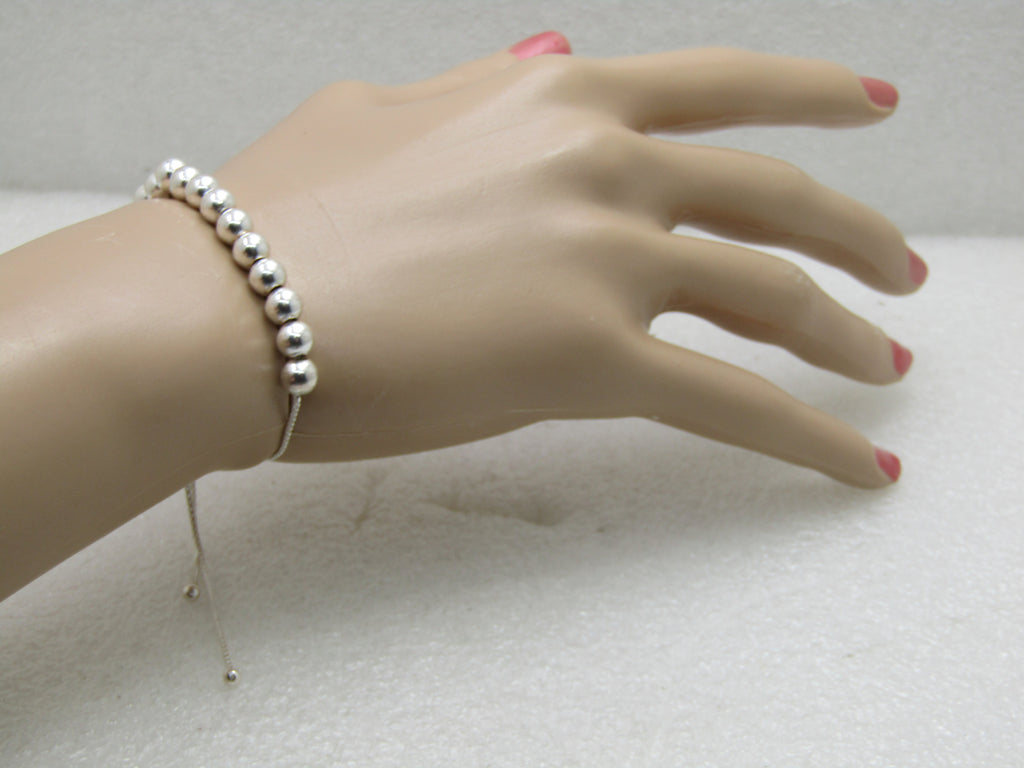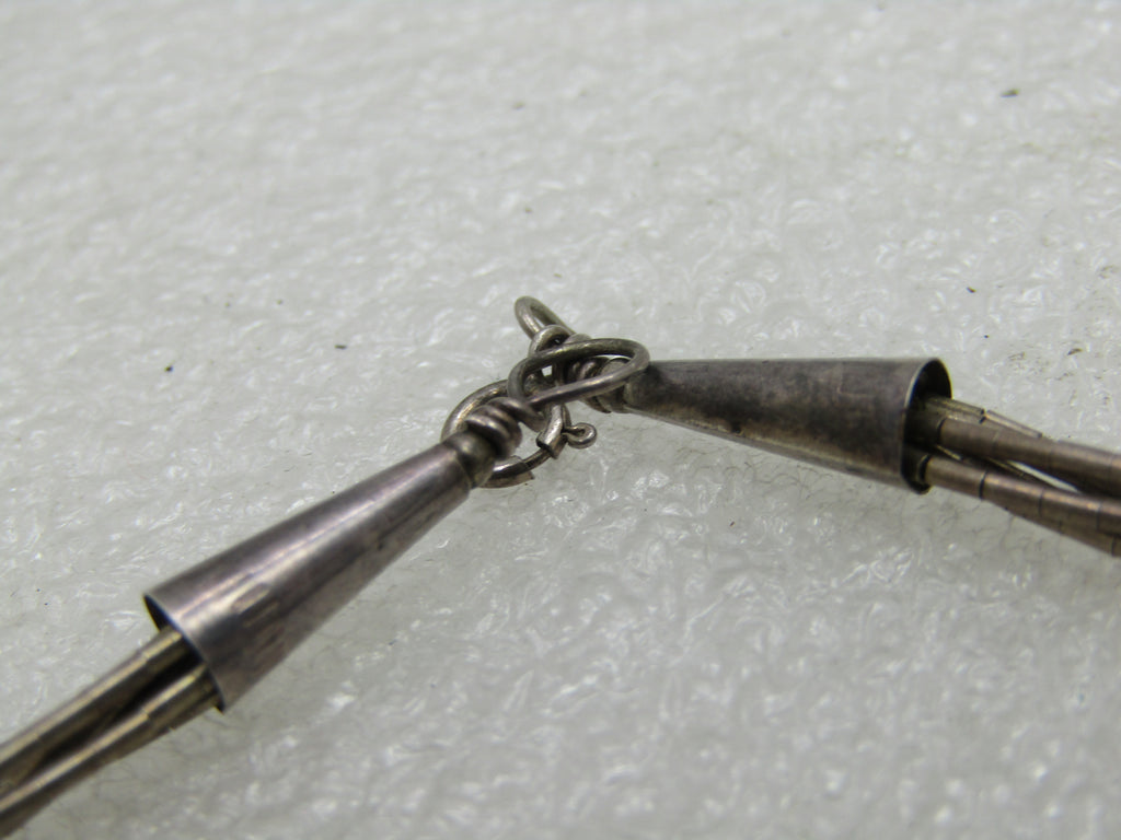 Vintage Southwestern Liquid Silver Bracelet, 6 strands, 7" long.  Woven offset square design with turquoise and silver beads in a square set on it's end across the center of the bracelet which is approximately 1" across at center.  This has cone end caps that have a stamped southwestern/Native American design.  Spring clasp.  1960's-1970's and in very good condition other than light oxidation that can be polished.  Clasp is marked  .925 and beads and clasp have been tested and test as sterling.  It is not signed by the maker.  See photos.  (Lot. Loc. W7.30.8.1316.1X1) (LD 9/11/19).