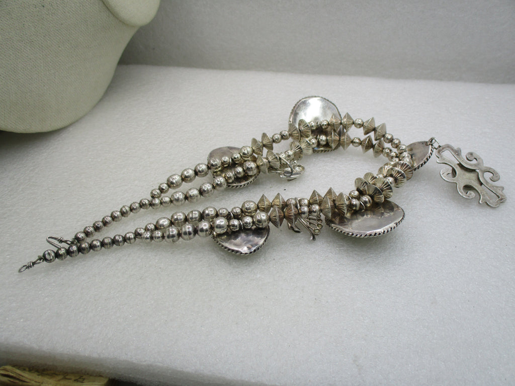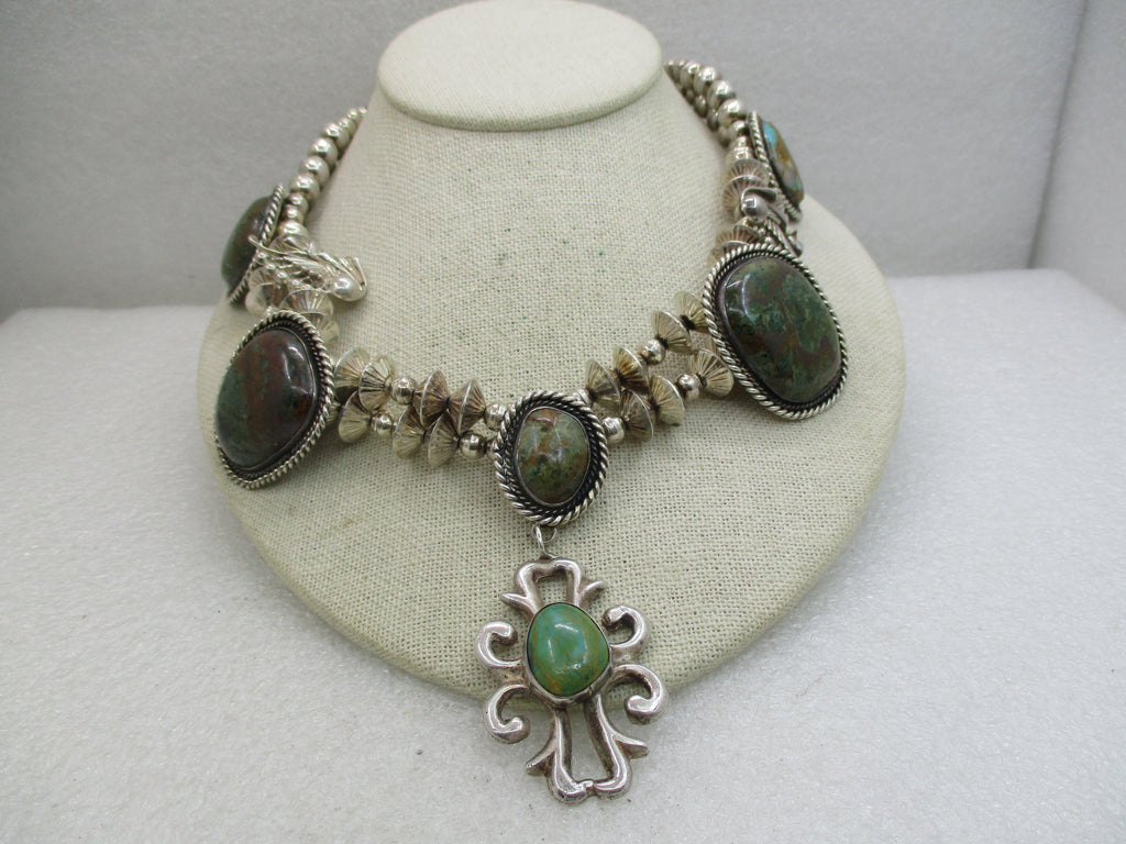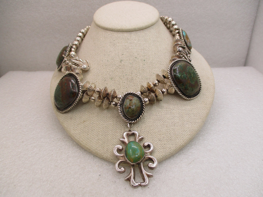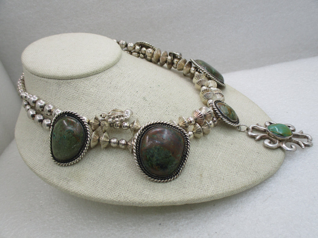 Vintage Southwestern Sterling Turquoise Squash Blossom-like Necklace, 17" with Navajo pearls and fluted beads - double strand with what I believe is Ajax Mine turquoise from Arizona. Heavy necklace at appx. 141.40 grams. Five green and brown mottled turquoise in rope accented framed bezel-set stones set on the double-strand. They range in sizes from 26mm tall to 39mm tall and irregular shaped. from the smaller stone at center there is a scrolled pendant that dangles with a raised green turquoise stone, bezel set and appx. 18mm by 14.5mm. This tests solidly as silver. It is not signed by the maker that I could find. On each side of the necklace between the last two turquoise stones there is a 1,25" squash blossom accent that is connected to the top strand. Age is appx. 1970's-1980's Very good condition. (INV W. 2.2920.33X, WB747, LMV LD 3/2/20)