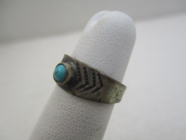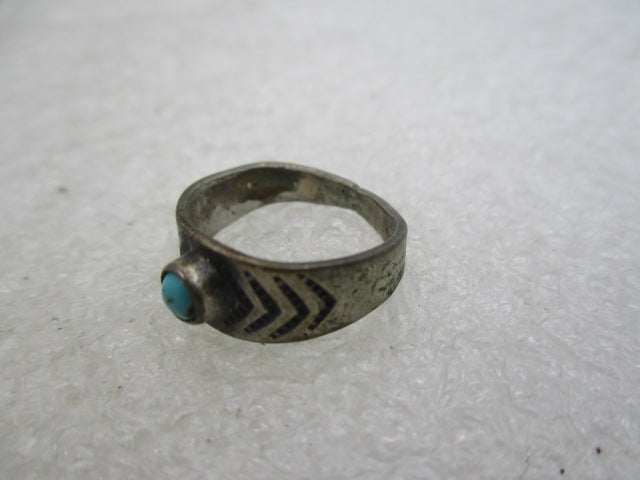 Vintage Sterling Southwestern Turquoise Stamped Ring, Sz. 3, 2.05gr. It has a round 3mm turquoise cabachon bezel set and raised over the 6.5 mm that tapers down to 2.5mm at the back of the finger. The ring was resized as you can see the joned area at the back of the finger - likely downsized. A little rustic work but still a nice ring that tests as sterling. It is not marked or signed. Good condition with oxidation that can be polished. Age is appx. 1960's-1970's. It has stamped arrow-like design pointing out on each side of the ring away from the stone. ((INV. W.22220.9, NO. 726, LMV 3/8/20).