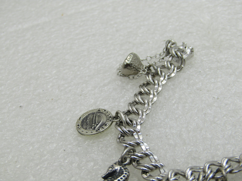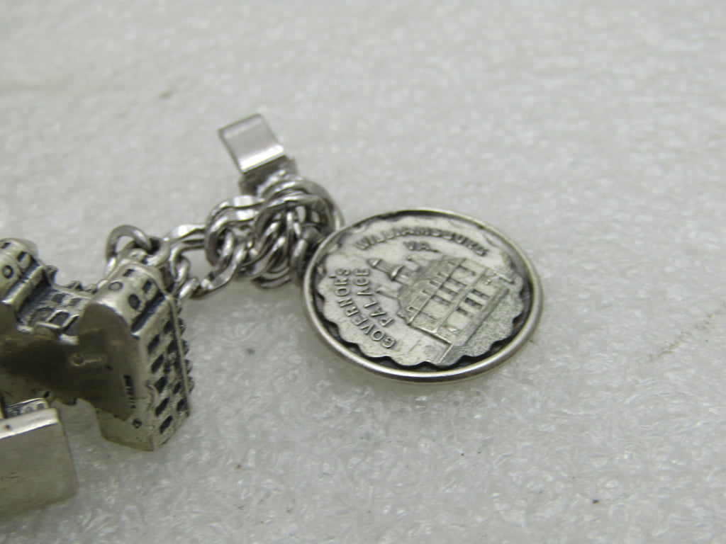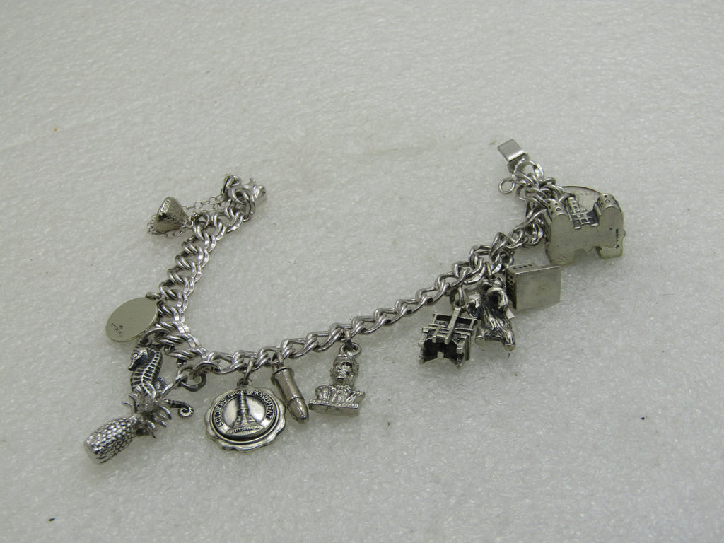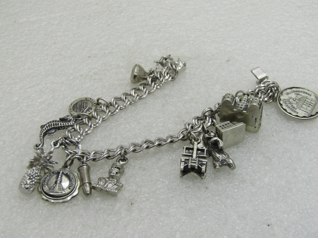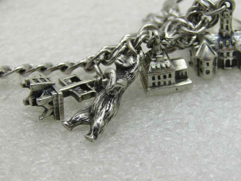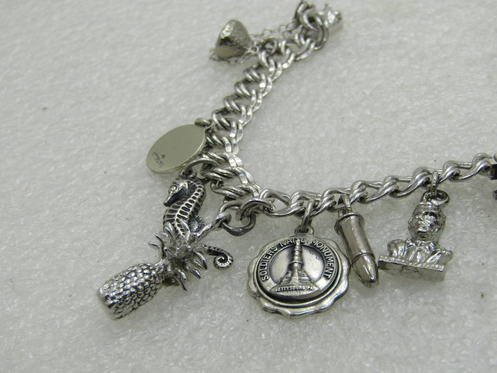 Vintage Sterling Silver Charm Bracelet, 7", Elco, 7mm Double Link, 12 Charms. Weight is appx. 47.21 grams. 1960's. Charms incude: Hershey kiss,bullet, Atlantic City Convention Hall, seahorse, 3-D pineapple, Soldier's Monument, Lincoln, stockade, Black Bear-Pennsylvania, Independence Hall & other building, Governor's Palace, Williamsburg, VA. 1950's-1960's. Signed Elco on double-link charm bracelet, other signed sterling too, some signed by maker (Bell Trading, Bruce Sterling and others). All good to very good condition. (INV.2.8o919.2X2).