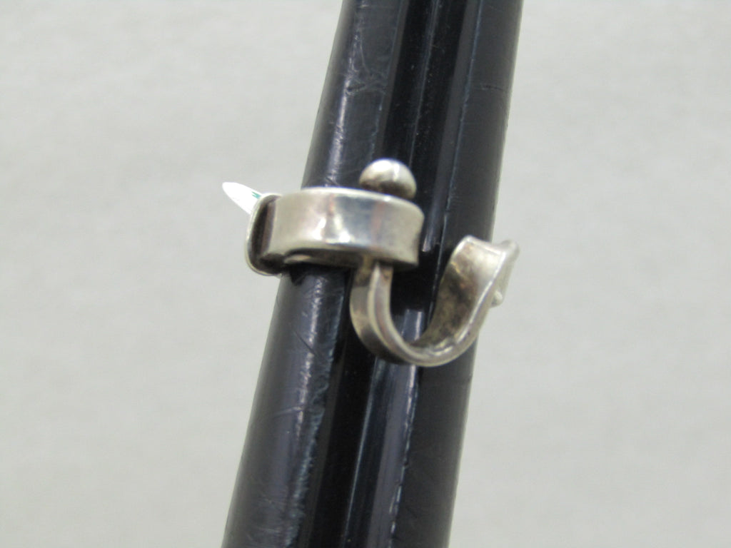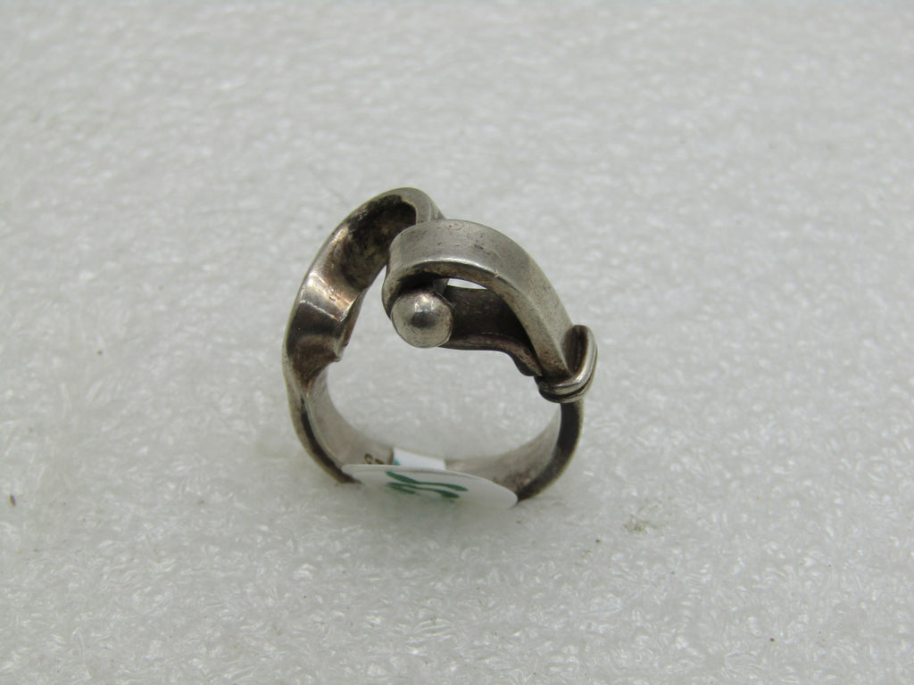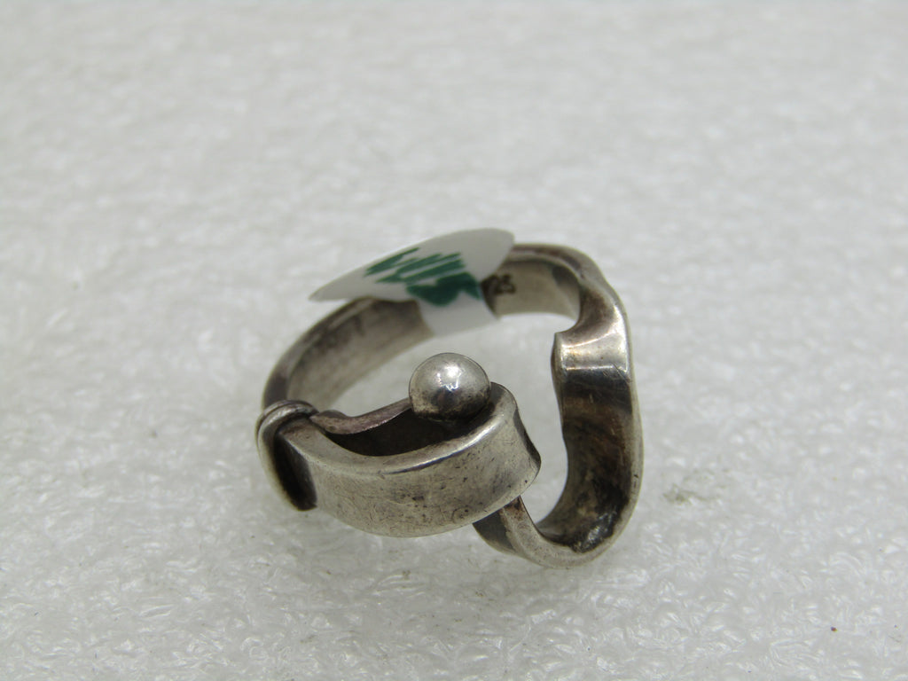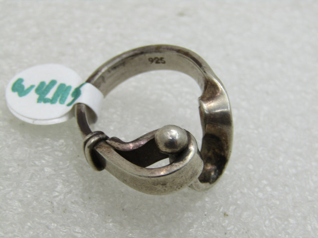 Vintage Sterling Silver Modernist Belt Ring, Sz. 7, Unique and hand made - great silver work. Unisex.weight appx. 8.50 grams. Marked .925 and tested. Signed but cannot read. Great unisex deign with a bend and loop hook modernist design. Band is appx. 4.5mm wide. See photos for visual description. Very good condition with light oxidation. (Inv. W.4.115G.8)AUC.9.14