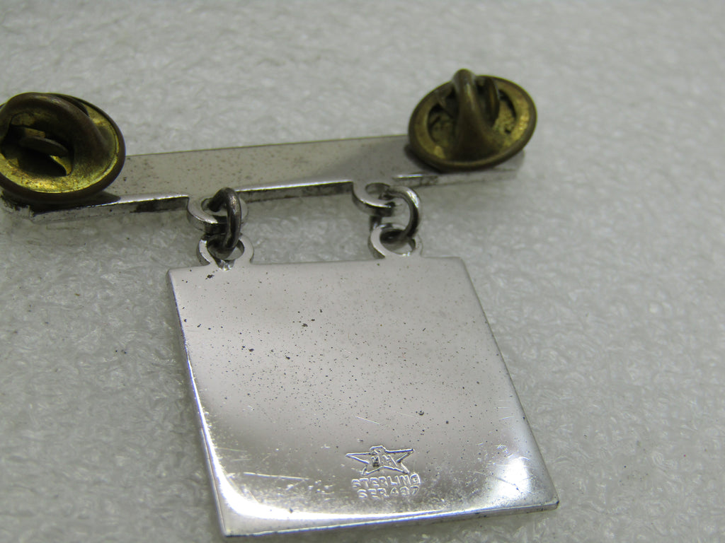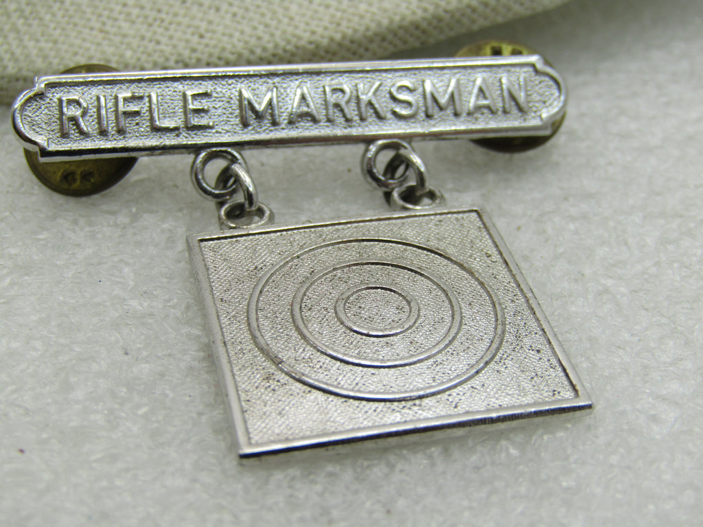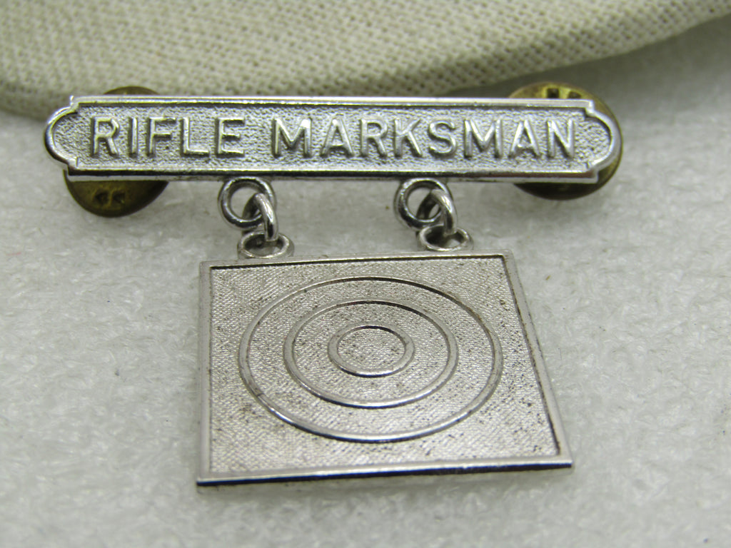 Vintage Sterling Silver Rifle Marksman Medal, Signed HH SER 437. 15.24 grams. 2.5" wide on the bar that has the wording Rifle Marksman with a dangling target drop. The height of the medal is appx 1.5" tall. Signed HH, Sterling, and SR 437 on back. Very good condition on the memdal itself, brass clutches on the back which may not be original. (INV. W3720.1X1, SS1166 LMV LD 5/2/20)