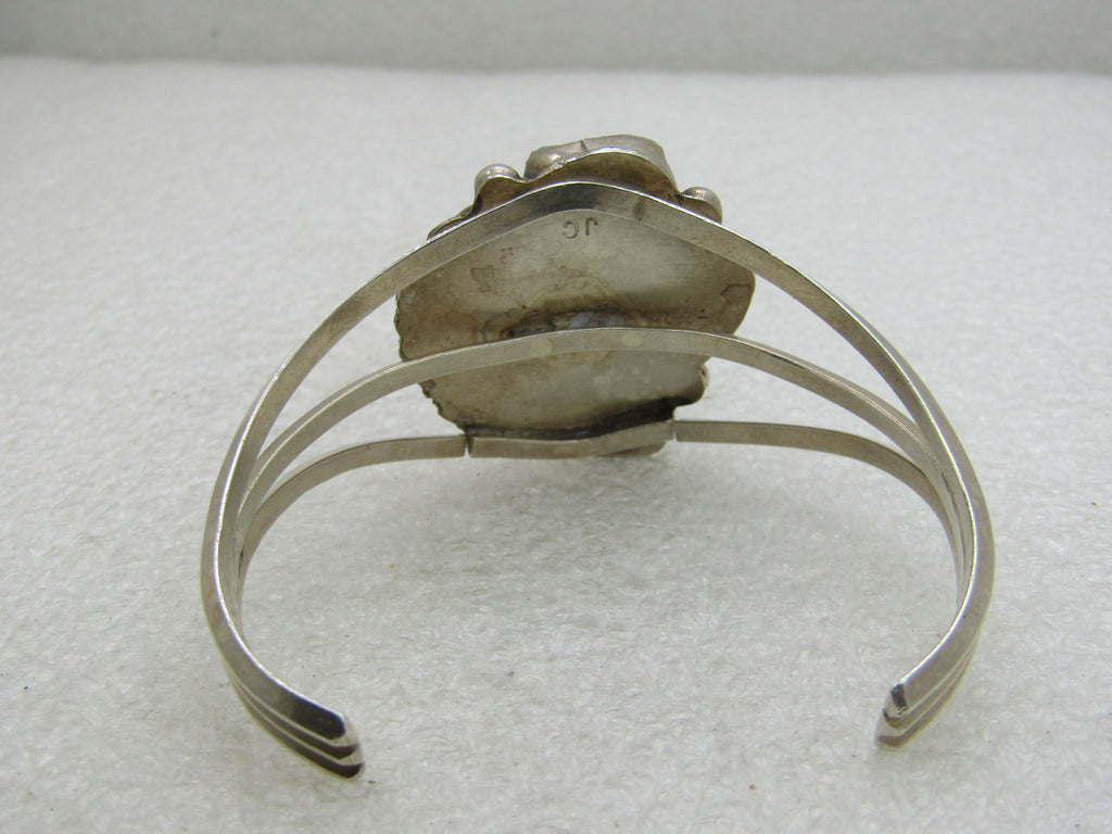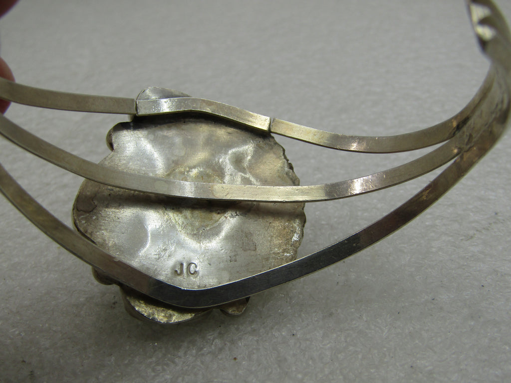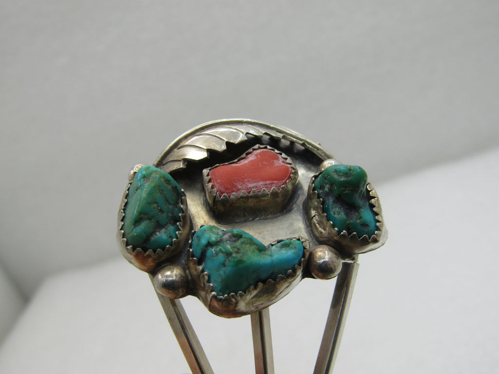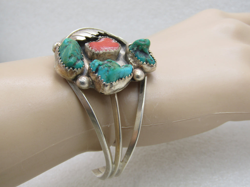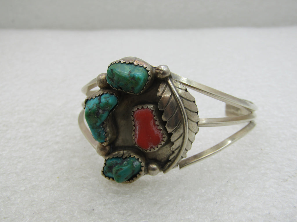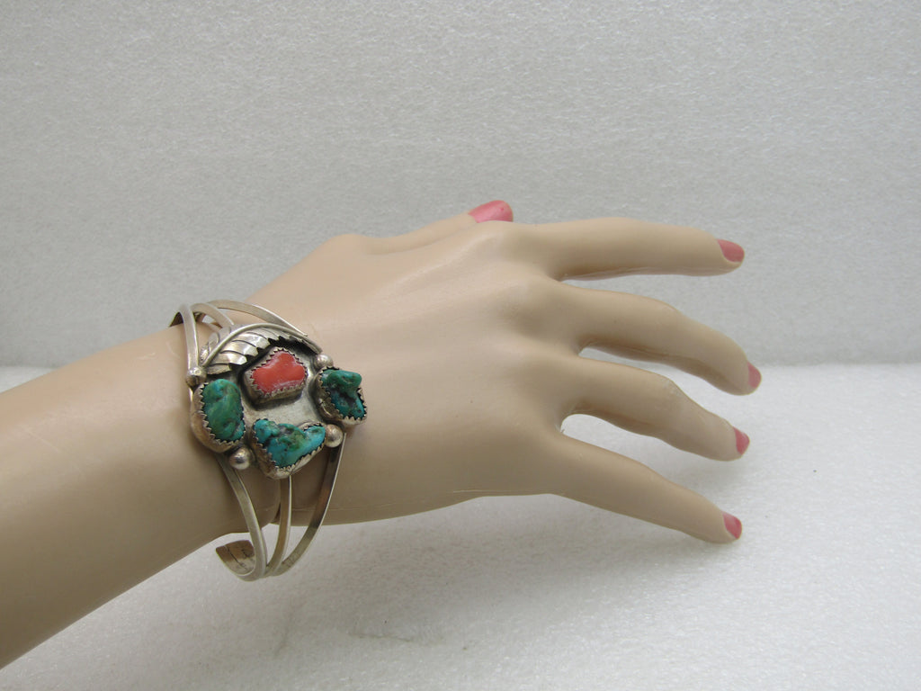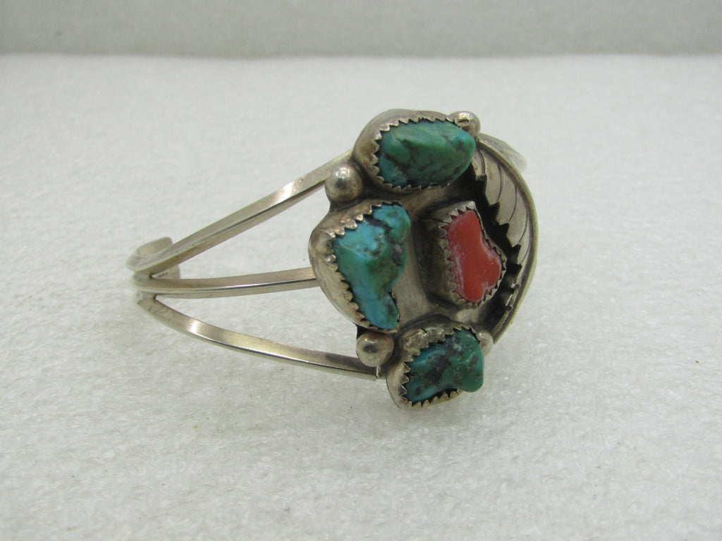 Vintage Sterling Jessie Claw Turquoise Coral Cuff Bracelet, Navajo 6.5" (5.25 inside measurement with 1.5" opening). Three turquoise nuggets that are sawtooth bezel-set and range from 1 2mm to 15mm and single coral sawtooth bezel-set that I appx. 13mm by 8.5mm. Shadowbox setting with father and bead accents. The top of the cuff is appx. 1.5" down thew wrist and 1.25" on top of the wrist with a triple band on the sides that forms into a single triple fused cuff that is appx. 3/8" at the back of the wrist. signed J.C. which is believed to be Jessie Claw, Navajo silver artist. Age is appx. 1960's-1970's. Weight is appx. 27.04 grams. This did have a crack at the back of the band which can be seen in the photos. My local silversmith has repaired this. Other than the fracture it is in good condition. It is a slightly rustic, less polished design but very nice. Age is apx. 1960's-1970's. (INV. W.3720.5X5, SS883, NL LD 3/29/20).