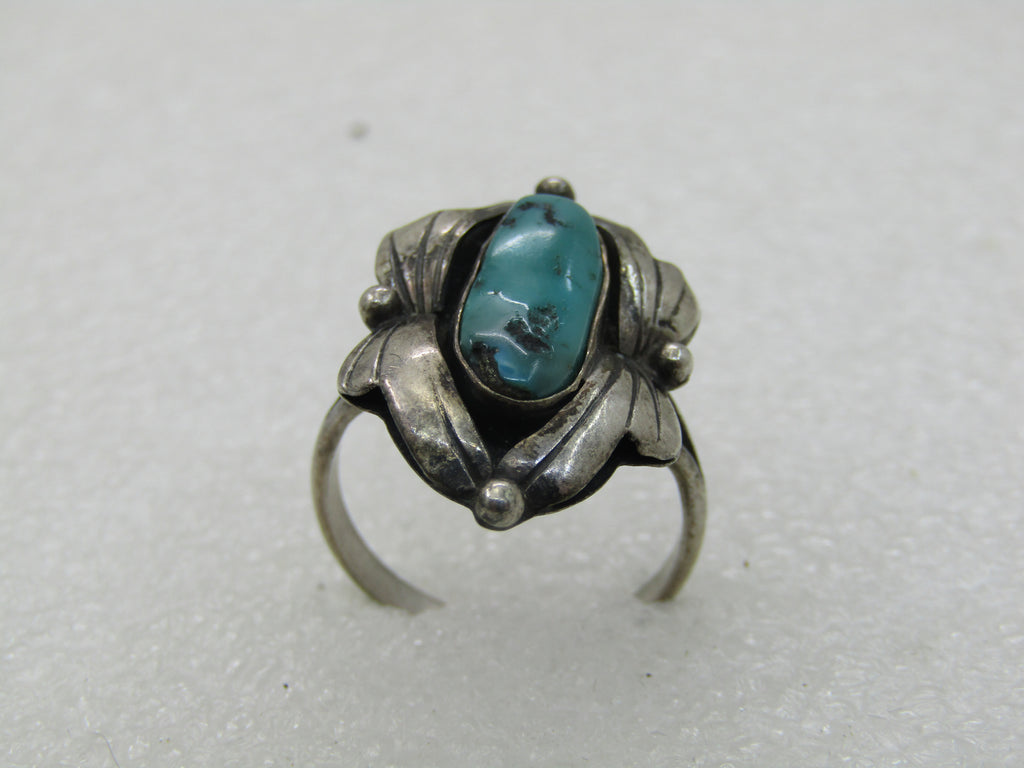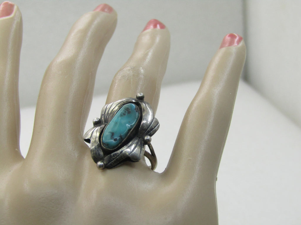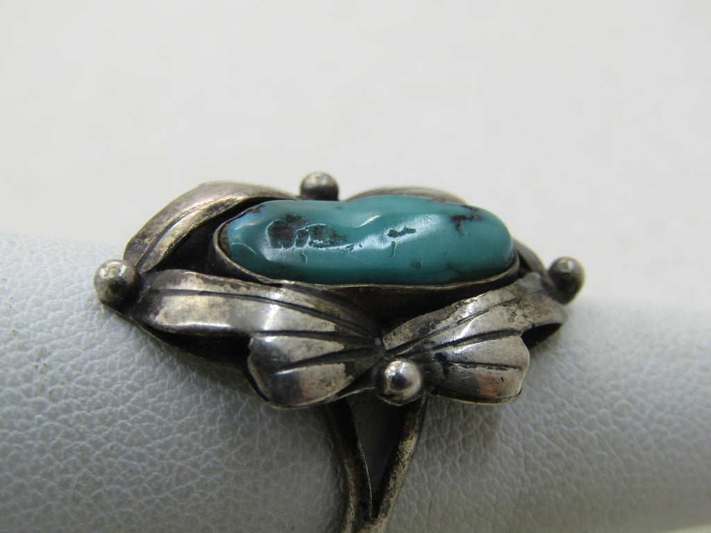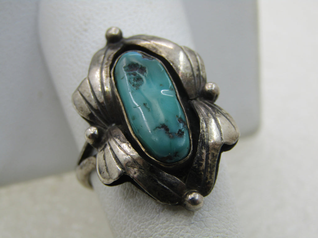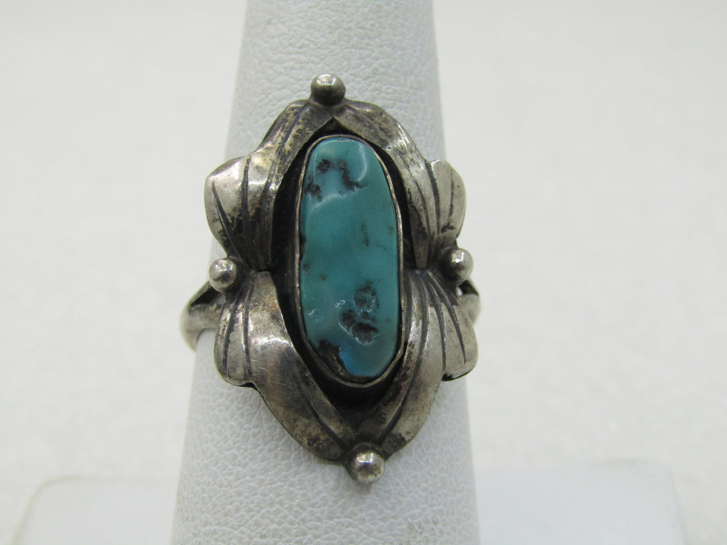Vintage Sterling Southwestern Turquoise Ring, Sz. 8.5, 1960's-1970's. This has a recessed shadowbox set turquoise long oval stone that is appx. 16mm by 6.5. It has raisesd feather/leaf-like ccents and beded accents around the stone. The band is a split V at the sides and is appx. 6mm at top shoulders and tapers to apx. 2.4mm at the back of the finger. The band is rounded. It is signed sterling and tested. Age is appx. 1970's. Not signed by the maker. (INV E102520.2X4 SS2968 LMV LD 11/1/20)