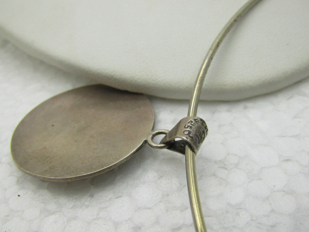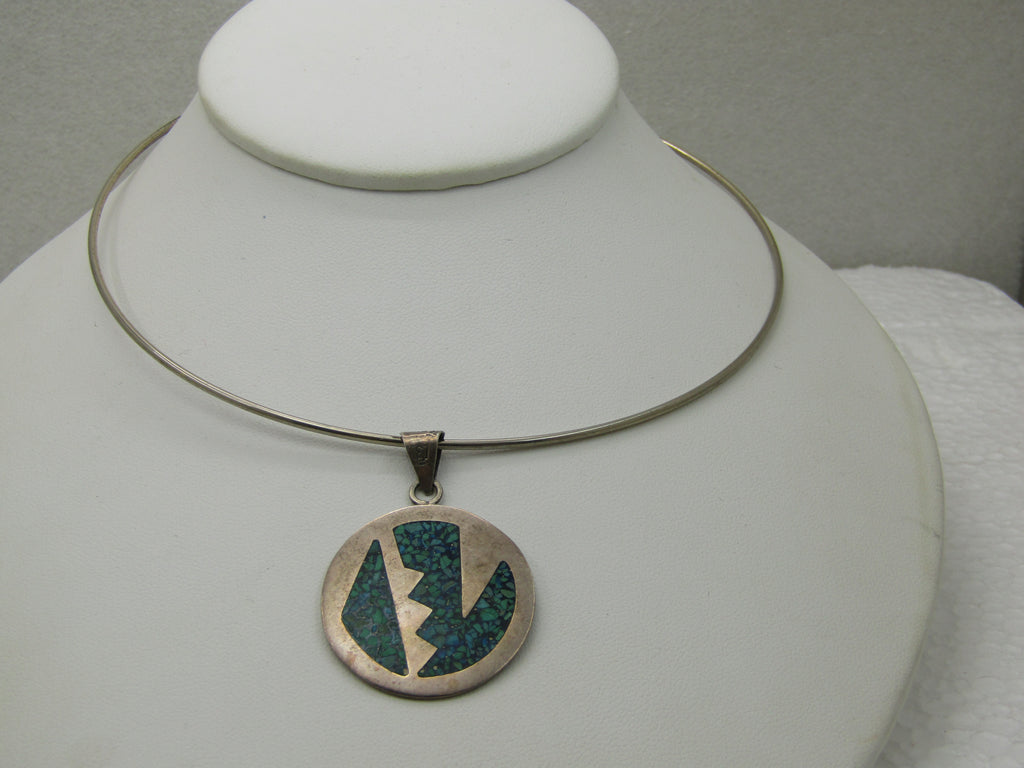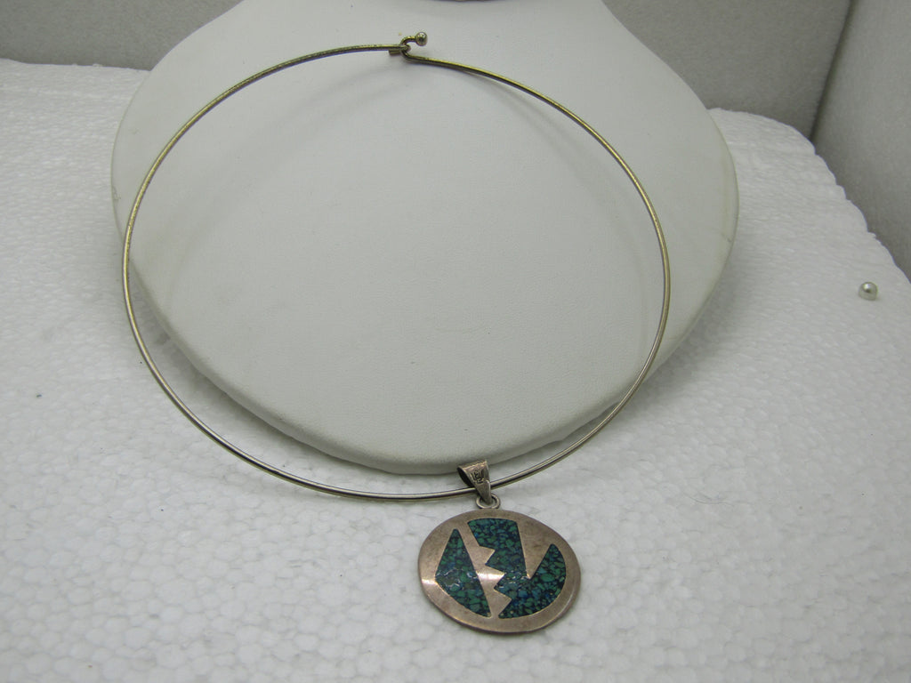 Vintage Taxco Mexico Turquoise Chip Pendant on 15" Collar Necklace. The pendant is 1.75" long incuding bail, and 1.25" wide. Signed CHR and Taxco, .925 Mexico. The weight of the pendant only is appx. 5 grams. The necklace is a 15" hook collar necklace - that is not sterling silver. The pendant has a jagged inlaid turquoise chip design with a tapered bail with stamped makers mark ont he bail. Age is appx. 1960's-1970's. Good condition with some oxidation on the pendant that can be polished and some finish wear on the collar. See photos. (INV. W22020.1X1 SS1447 LMV LD 6/6/20)
