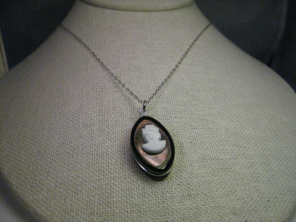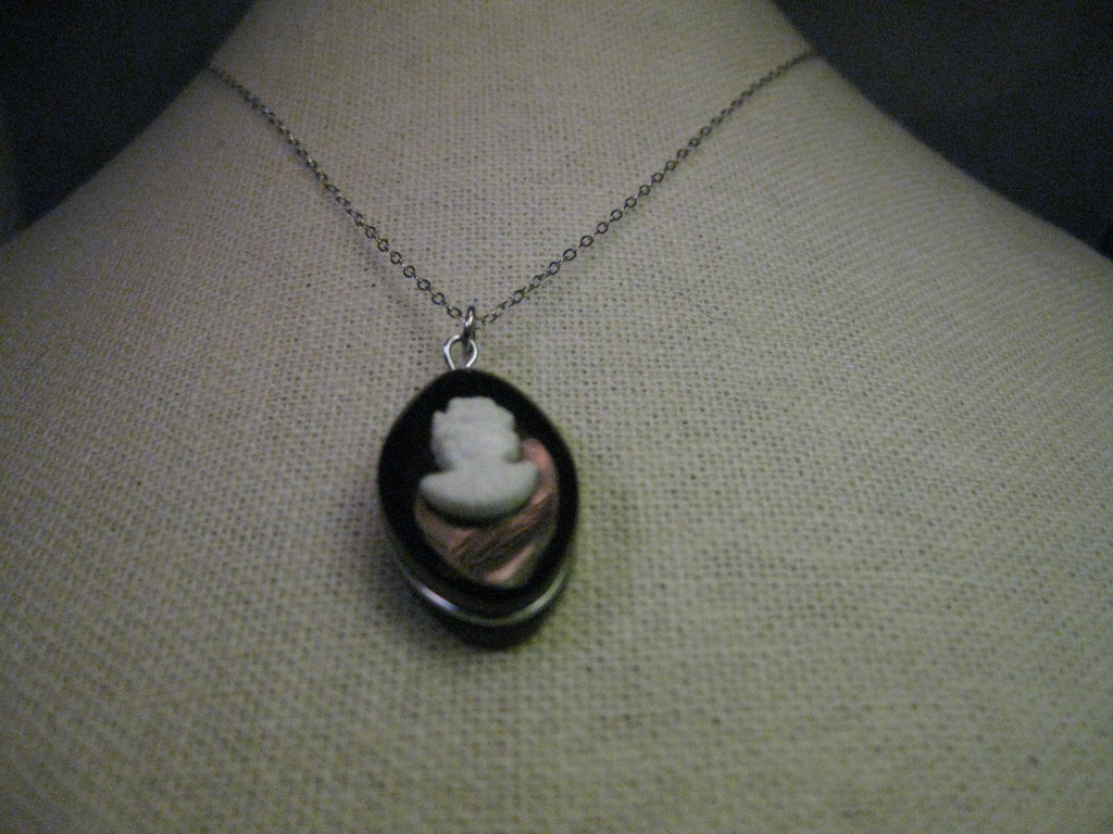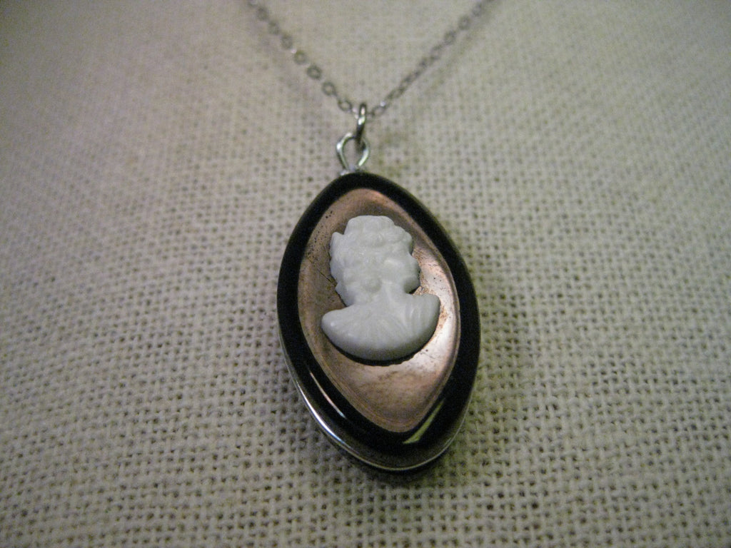 Vintage Sterling Silver Cameo Necklace - Black with white cameo raised on top - sterling collar bezel with with twist and bale on top - on 16" chain. The cameo is about 1/4" thick and a little over 1" tall and 2/3" wide. There is a small blemish on the back of the cameo on the black (a chip on the edge). It is in very good condition other than that chip. Exact age is unknown. See photos. (Marked sterling and tested)