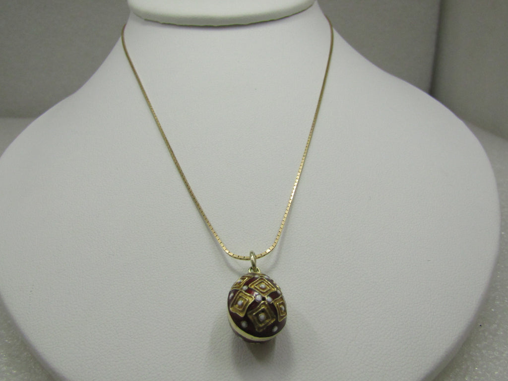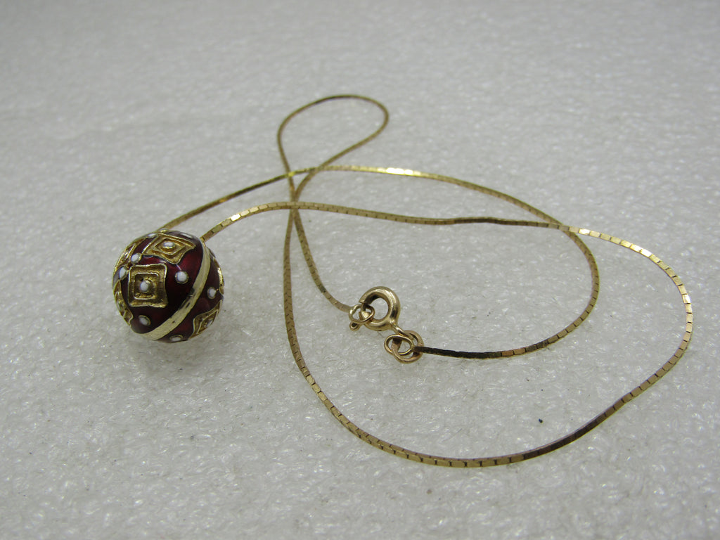 Vintage 14kt Gold Red White Guilloche Egg Necklace, 16"
