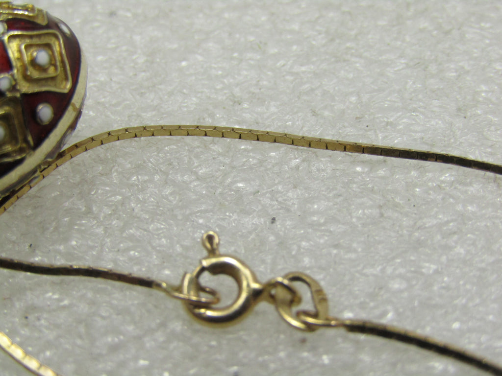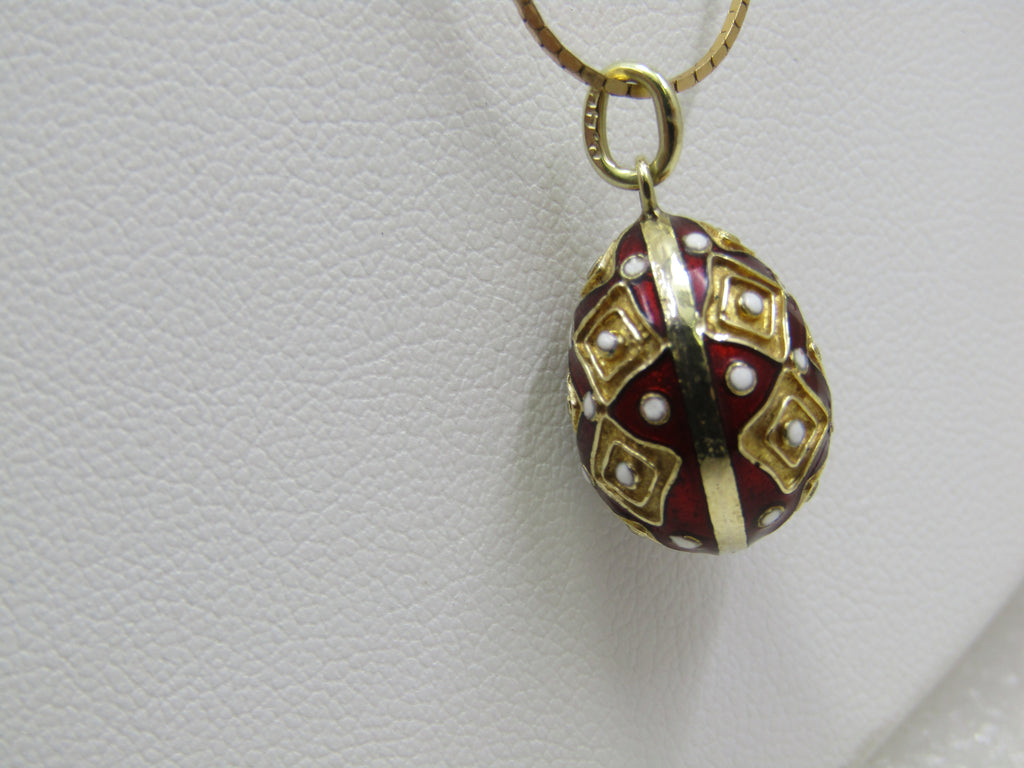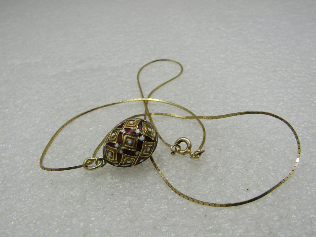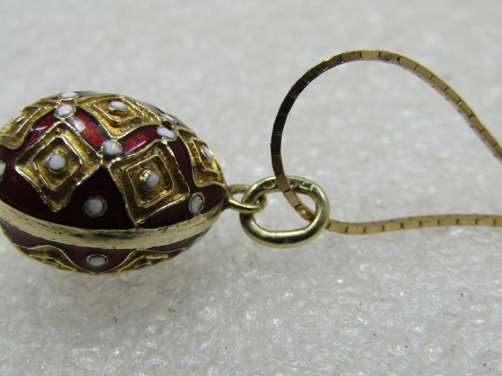 Vintage 14kt Gold Red White Guilloche Egg Necklace, 16". The egg has markings on the bail 585 partially stamped on one side and other letters on the other that cannot be made out - believed to be Russian made and appx. 1960's. Deep red enameling with white enameled spots, gold accents. It is on a 16" square link chain with spring clasp, marked 14kt, Italy, and what looks like OA. The etwo piecesweigh appx. 5.56 gr. The egg is 3.26gr of that weight. The chain is therefore 2.30 gr. The egg is appx. 22.3 mm tall with ring and 12.5mm at the widest point from side-to-side. Appx. 12mm front-to-back. At the time of this listing there are two similar eggs out there with the same design but one is navy and the other light blue. The light blue is listed at $1625.00 and is also 14kt; the darker one is 18kt and listed at $1275, neither included the chain. Very good condition. Came from a PA sale. (INV. W. 6521.33X SS4897 J MV LD 6/7/21).
