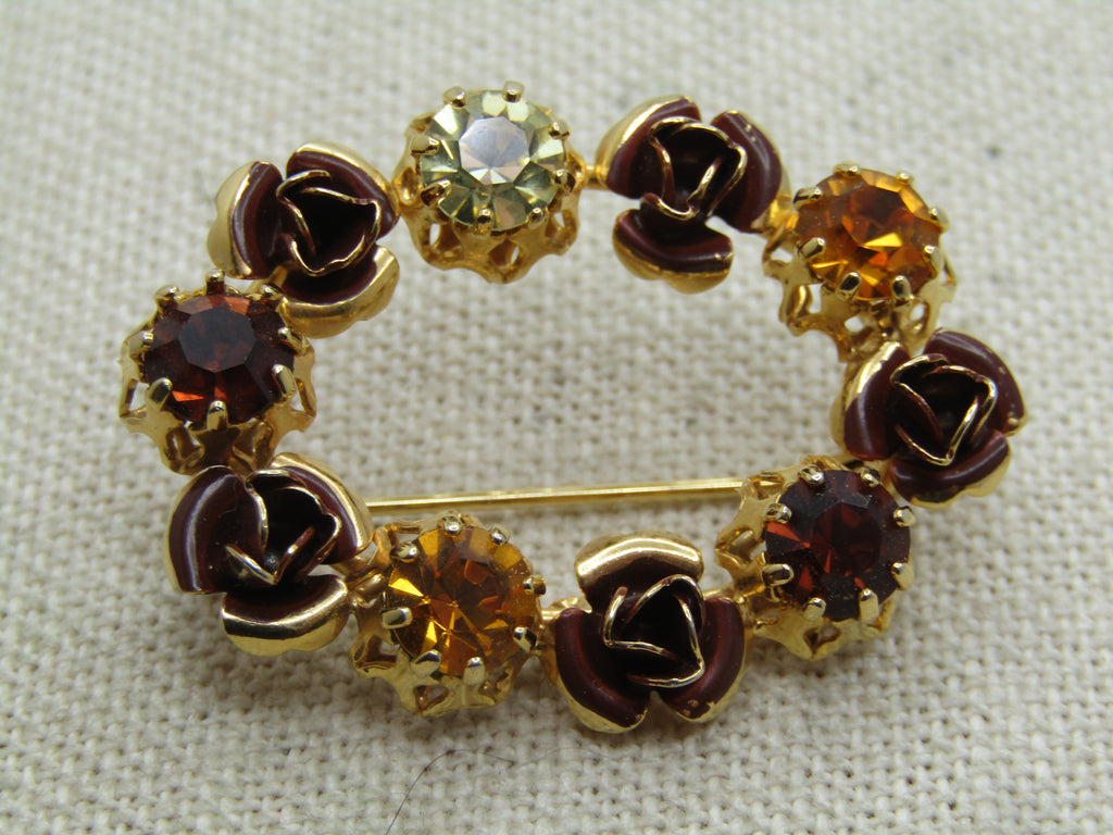 Vintage Austria Crystal Oval Brooch, Rose Blossoms, 1940's-1960's. It is appx. 1.5" wide and 1" tall with brown, honey, pale green stones alternating with rose blossoms. Gold tone. Locking clasp. Signed Austria. Very clean and in very good condition. (W1.1-31.16.6 SS14015 J LD 6/10/24) LMV 7/28/24)